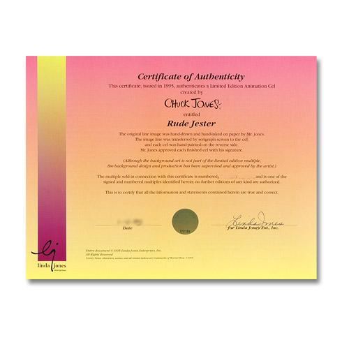 Own this amazing piece based on the original line image hand drawn and hand-inked on paper by Chuck Jones! "Rude Jester" is a sold out limited edition animation cel with hand painted coloring on sericel outline, numbered and hand signed by Chuck Jones (1912-2002)! Includes Certificate of Authenticity! Measures approx. 10.5" x 12.5".