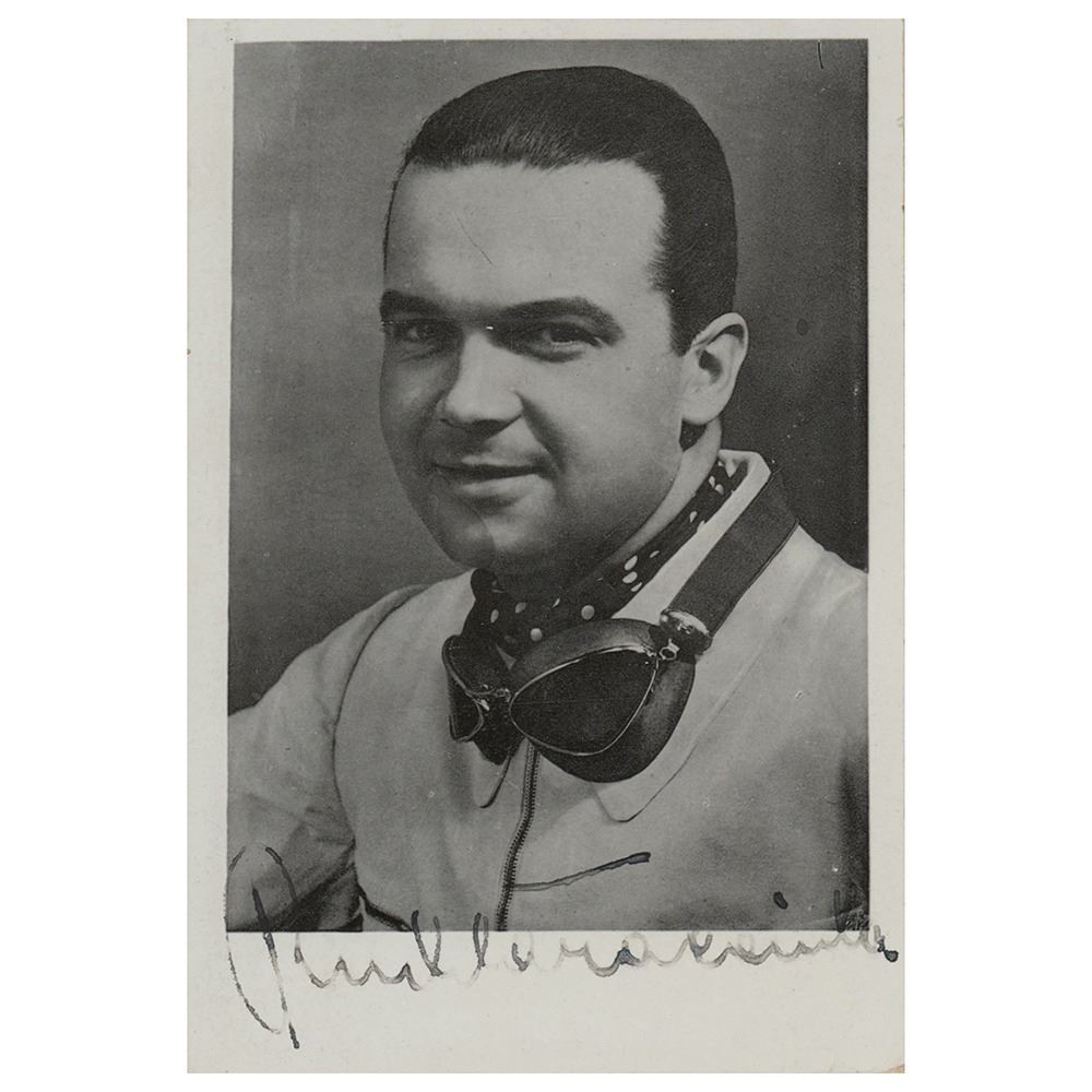 Uncommon 3.5 x 5.5 postcard photo of Caracciola in his racing suit and goggles, signed at the bottom in fountain pen. In fine condition, with some skipping to the signature.