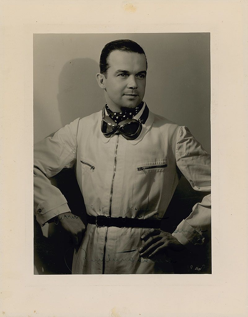 German race car driver (1901–1959) who won some 30 major championships, including the first German Grand Prix, before his death from a bone disease. Vintage oversized glossy 9.25 x 11.75 photo of Caracciola in his racing suit and goggles, signed and inscribed in fountain pen, in German, and dated 1938. A spot to top and bottom border and poor contrast to signature and inscription, otherwise fine condition.