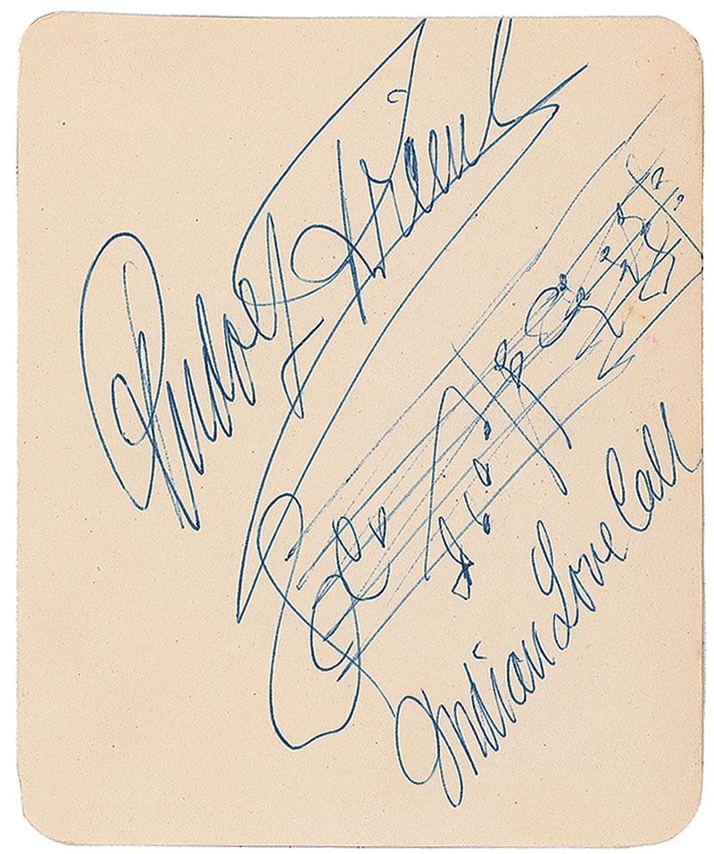 Crisp AMQS on an off-white 3.5 x 4.25 card. Friml pens three bars from his popular Broadway musical, titling it below, “Indian Love Call.” In fine condition.
