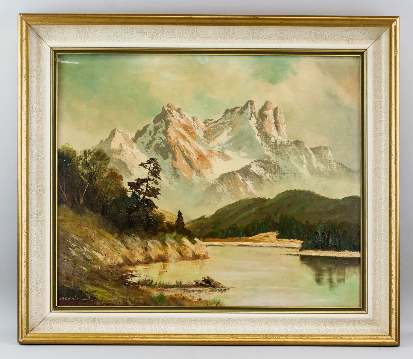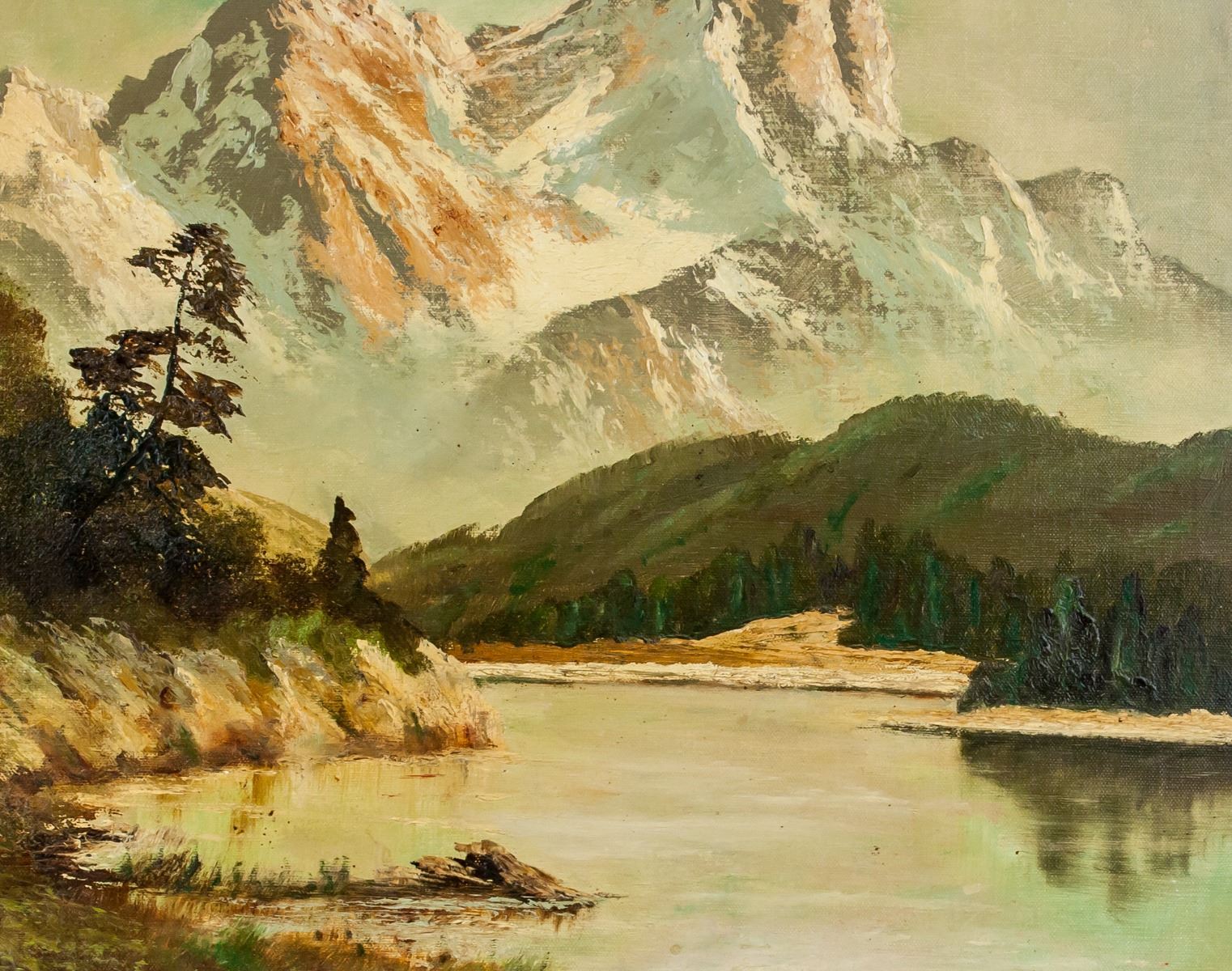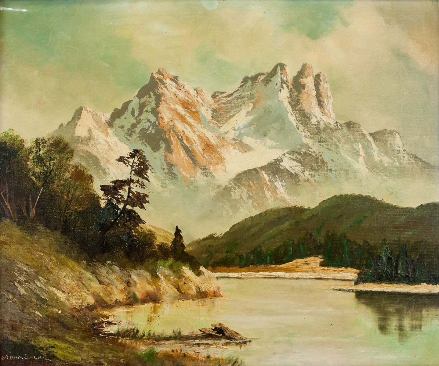 Oil on canvas on board, framed. Featuring a landscape scene of alpine lake in front of high mountains. Signed on the bottom left incised R. Grossmuller. Label affixed to verso inscribed Wilhelm Maass Kunstmaler Unterasbach bei Nurnberg Hauptstrabe 16 . Postscheckkonio Nurnberg Nr. 65761. Attributed to Rudolf Grossmuller (20th Century, German). 49.5 x 60 cm (19.5 x 23.5 inches). PROVENANCE: This item has limited provenance from a private German estate