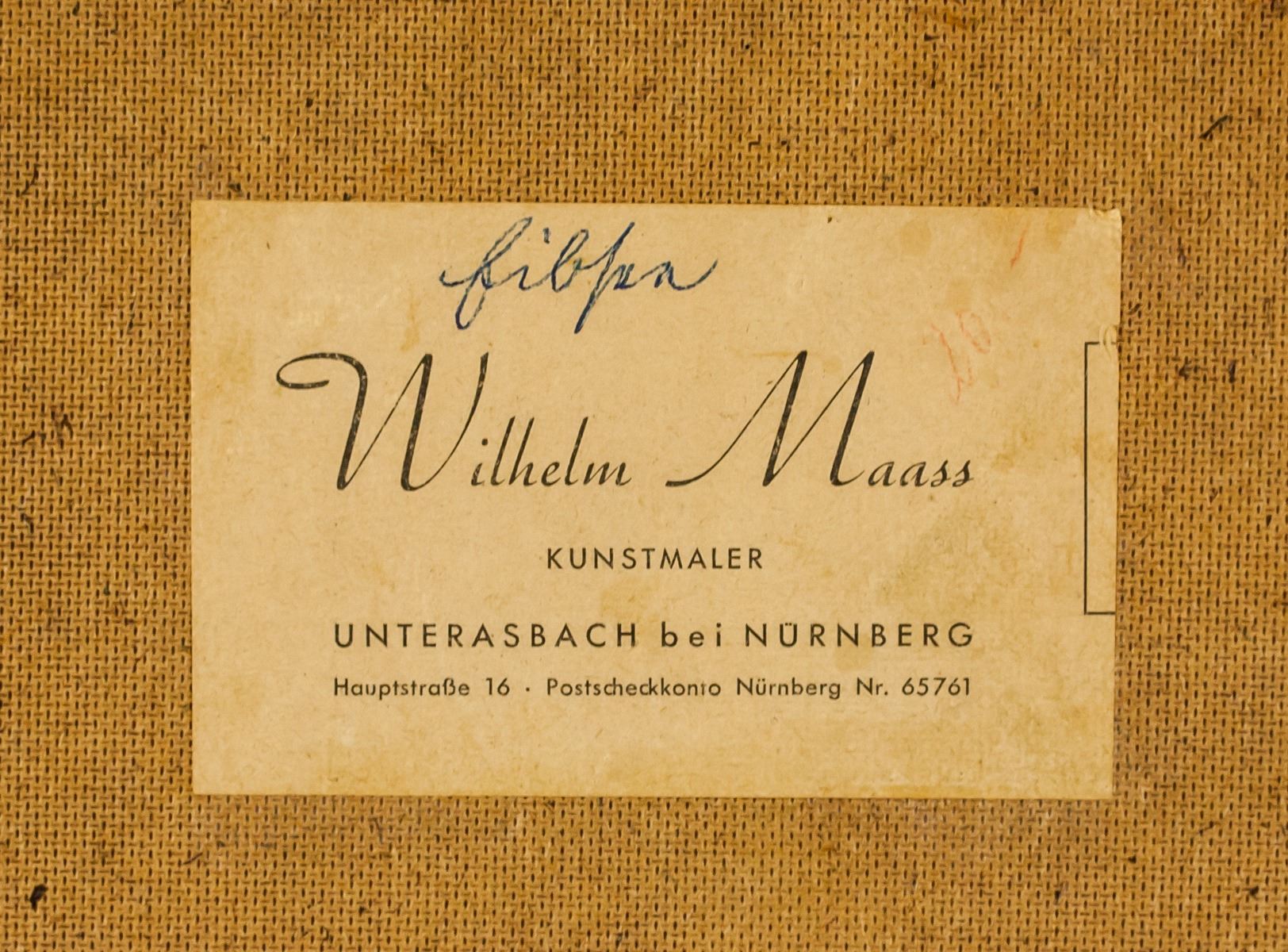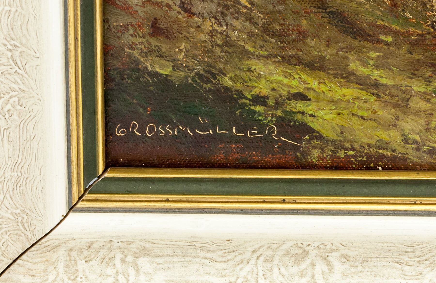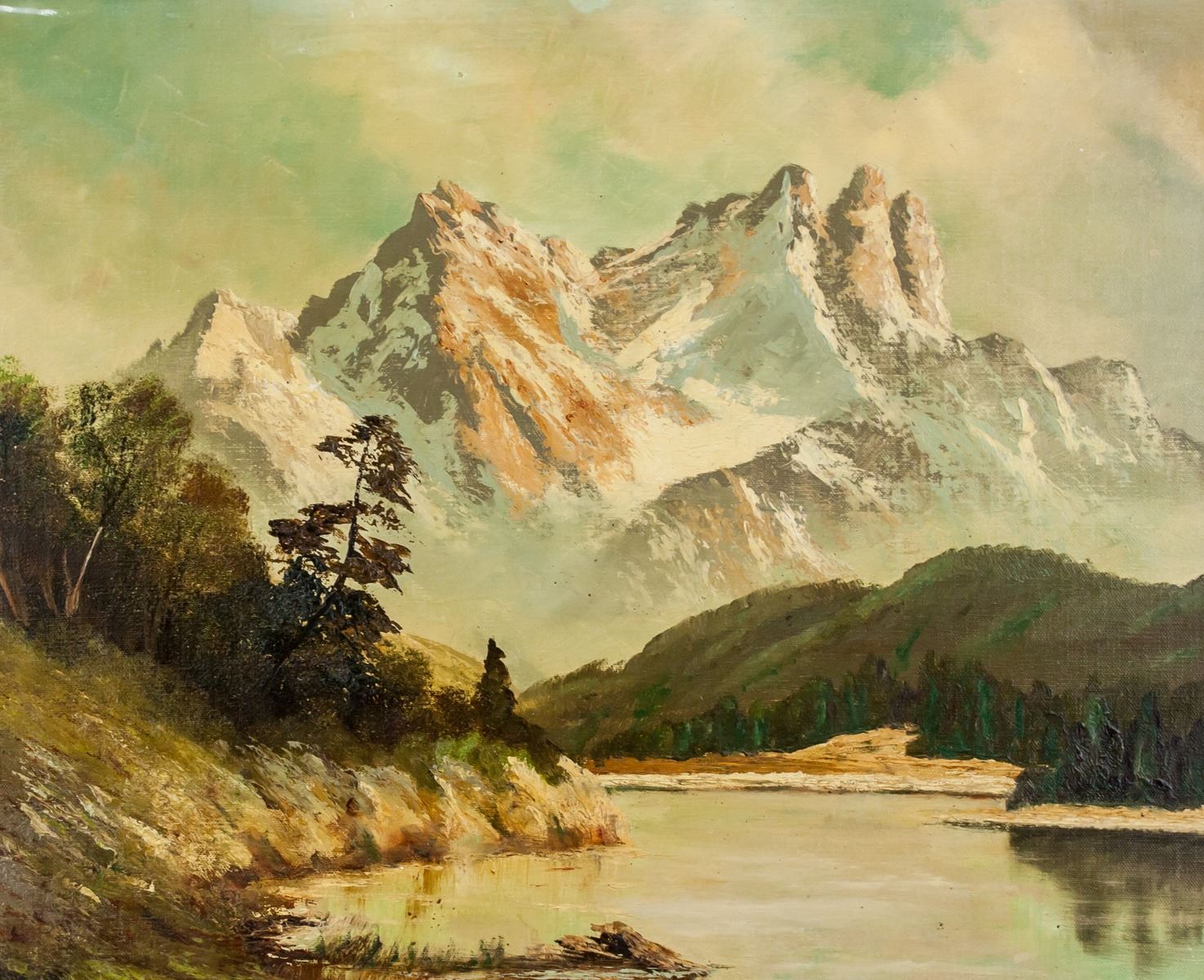 Oil on canvas on board, framed. Featuring a landscape scene of alpine lake in front of high mountains. Signed on the bottom left incised R. Grossmuller. Label affixed to verso inscribed Wilhelm Maass Kunstmaler Unterasbach bei Nurnberg Hauptstrabe 16 . Postscheckkonio Nurnberg Nr. 65761. Attributed to Rudolf Grossmuller (20th Century, German). 49.5 x 60 cm (19.5 x 23.5 inches). PROVENANCE: This item has limited provenance from a private German estate