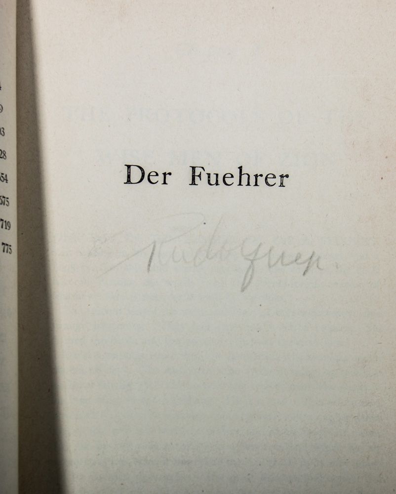 HESS, Rudolf Walter Richard. (1894-1987) Deputy Führer to Adolph Hitler from 1933 to 1941. Heiden, Konrad. Houghton Mifflin Company, Boston, 1944. First American Edition. Translated by Ralph Manheim. 5 ¼ x 8 in. (135 x 205 mm). 788 pages. Red cloth cover with splitting at the spine and wear to the cover. The pages are in good condition. Signed by Rudolph Hess in pencil on the inner title page while he was in Spandau Prison, where he had hanged himself. (The prison was torn down after this incident to avoid it becoming a shrine.) The signature has slightly faded, but still legible.