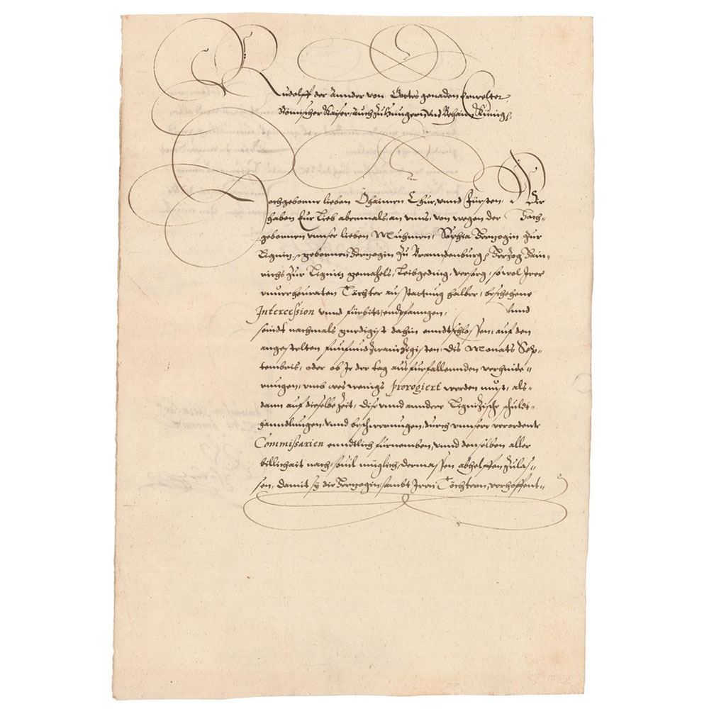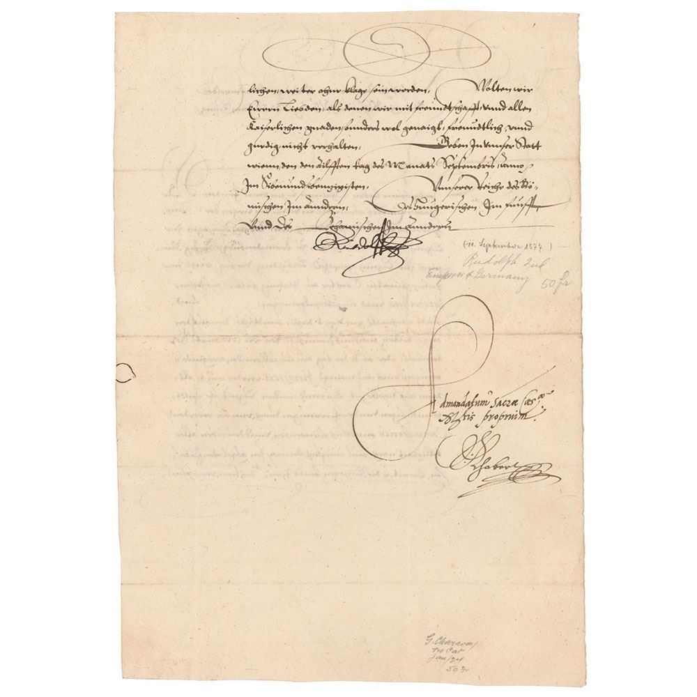 LS in German, signed “Rudolf,†one page both sides, 8.5 x 12, September 11, 1577. Untranslated document signed at the conclusion by Rudolf II. In fine condition.