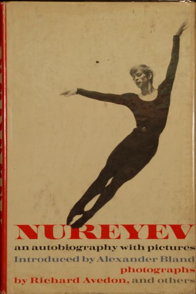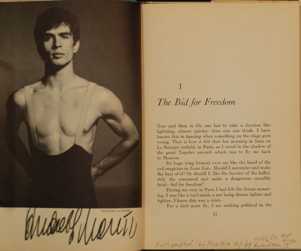 An Autobiography with Pictures. New York: E.P. Dutton (1963). Octavo, original blue cloth, original dust jacket. First American edition of Nureyev’s Autobiography, boldly inscribed by him, “Rudolf Nureyev,”below his photo. Book with 35 black-and-white photogravures of Nureyev, including 12 revealing portraits by Avedon (mostly full page), there is some spotting to dust jacket which is scarce.