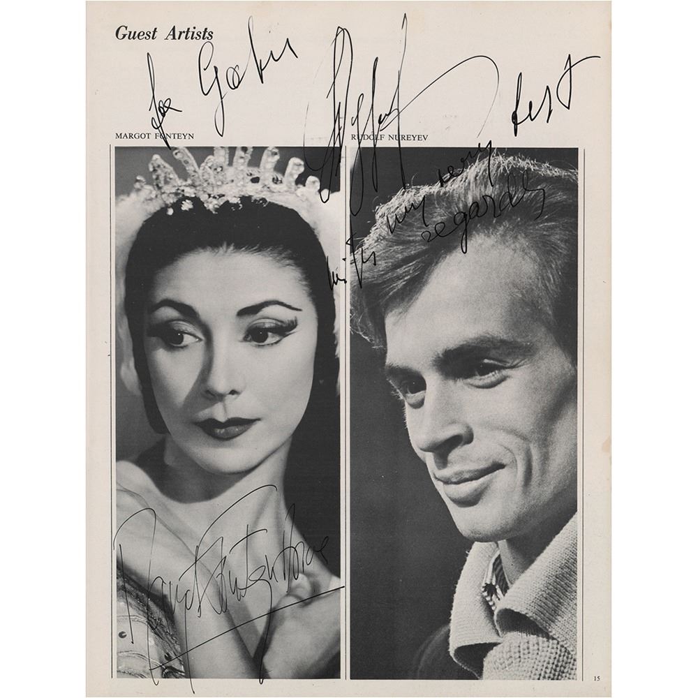 Souvenir program for The Royal Ballet of Covent Garden’s Royal Opera House, 66 pages, 9 x 11.75, which lists a performance of Romeo and Juliet on February 9, 1965, signed and inscribed inside on the same page in black ink, “For John, Rudolf Nureyev, with my very best regards†and “Margot Fonteyn.†In fine condition, with light handling wear to the covers.