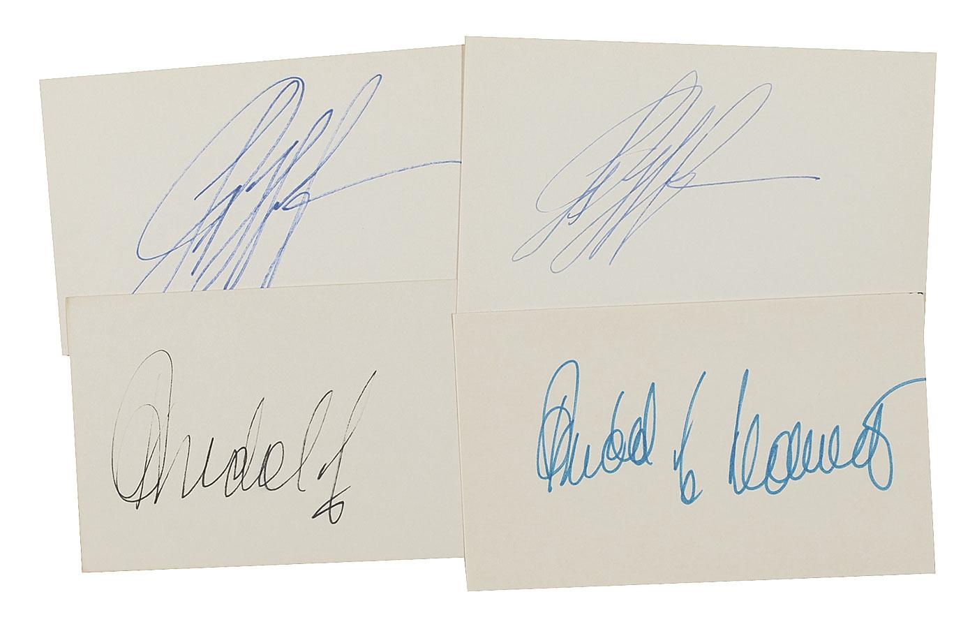 Four in-person ink and felt tip signatures, two in English and two lesser-seen Cyrillic signatures, with one of the English signatures first name only, on individual off-white 5 x 3 cards. In fine condition.
