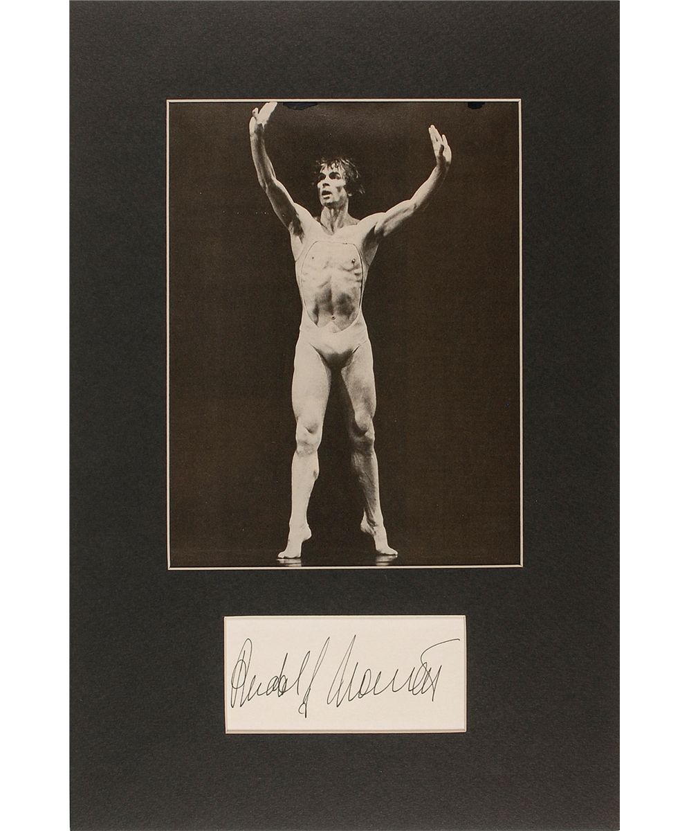 Felt tip signature, “Rudolf Nureyev,” on an off-white card. Matted with a photo of Nureyev performing to an overall size of 11 x 16.5. In fine condition.