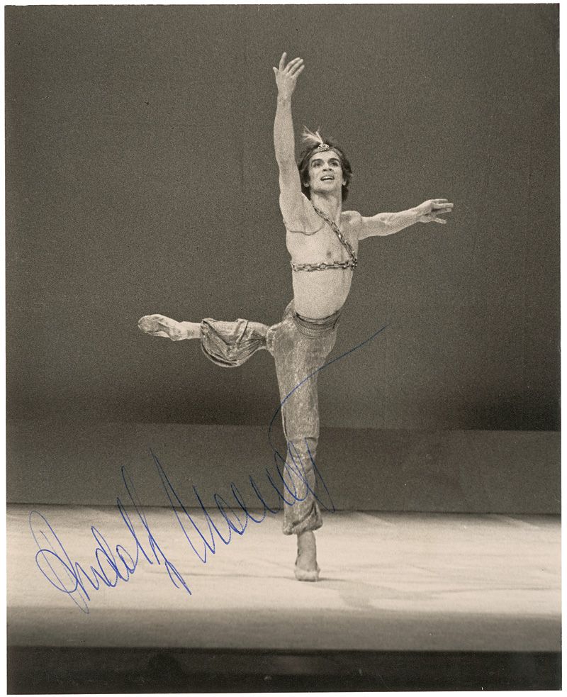 Matte-finish 8 x 9.75 photo of Nureyev performing, signed in blue ballpoint. In fine condition, with a few dings to right edge.