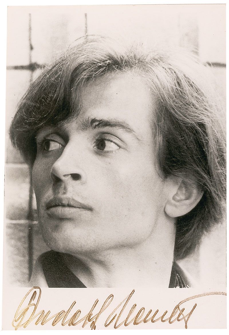 Semi-glossy 3.25 x 5 headshot photo of Nureyev, signed in the lower border in black felt tip. A couple creases to the lower right and slightly trimmed edges, otherwise fine condition.