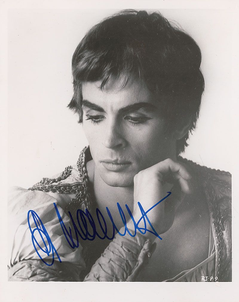 Glossy 8 x 10 photo of Nureyev in costume, signed in blue felt tip, “R. Nureyev.” Some scattered light creases and surface impressions, and a couple of spots to finish, otherwise fine condition.