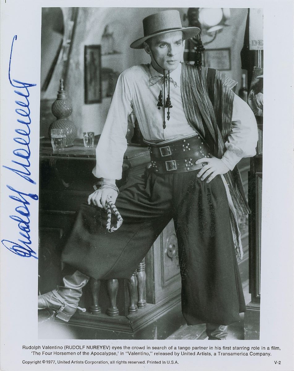 Glossy 8 x 10 United Artists publicity photo of Nureyev as Rudolph Valentino from the 1977 film Valentino, vertically signed along the left border in blue ink. In fine condition, with an area of some kind of surface residue on Nureyev’s left pant leg.