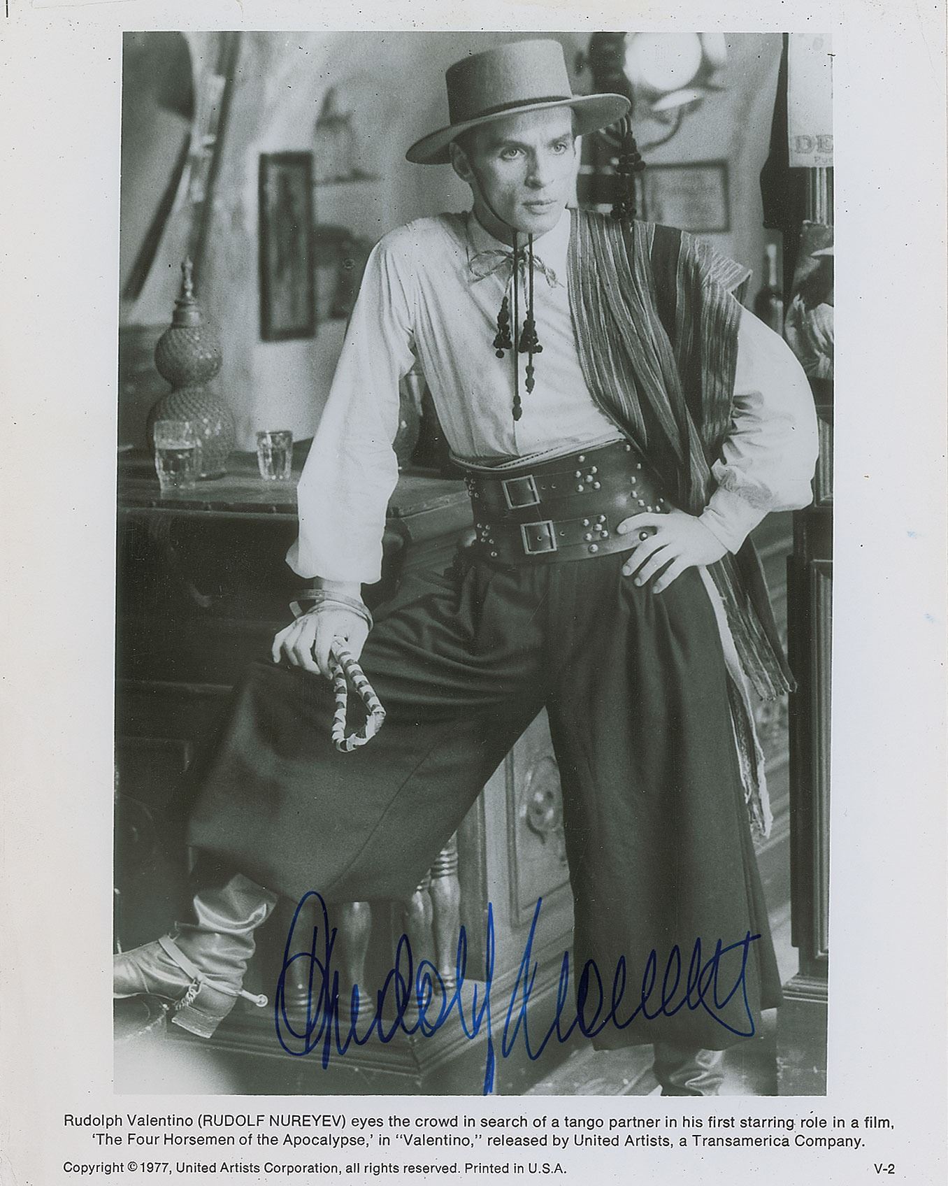 Glossy 8 x 10 photo of Nureyev in costume as Rudolph Valentino in the 1977 film The Four Horsemen of the Apocalypse, signed in blue felt tip. In fine condition, with some light surface impressions and scratches.