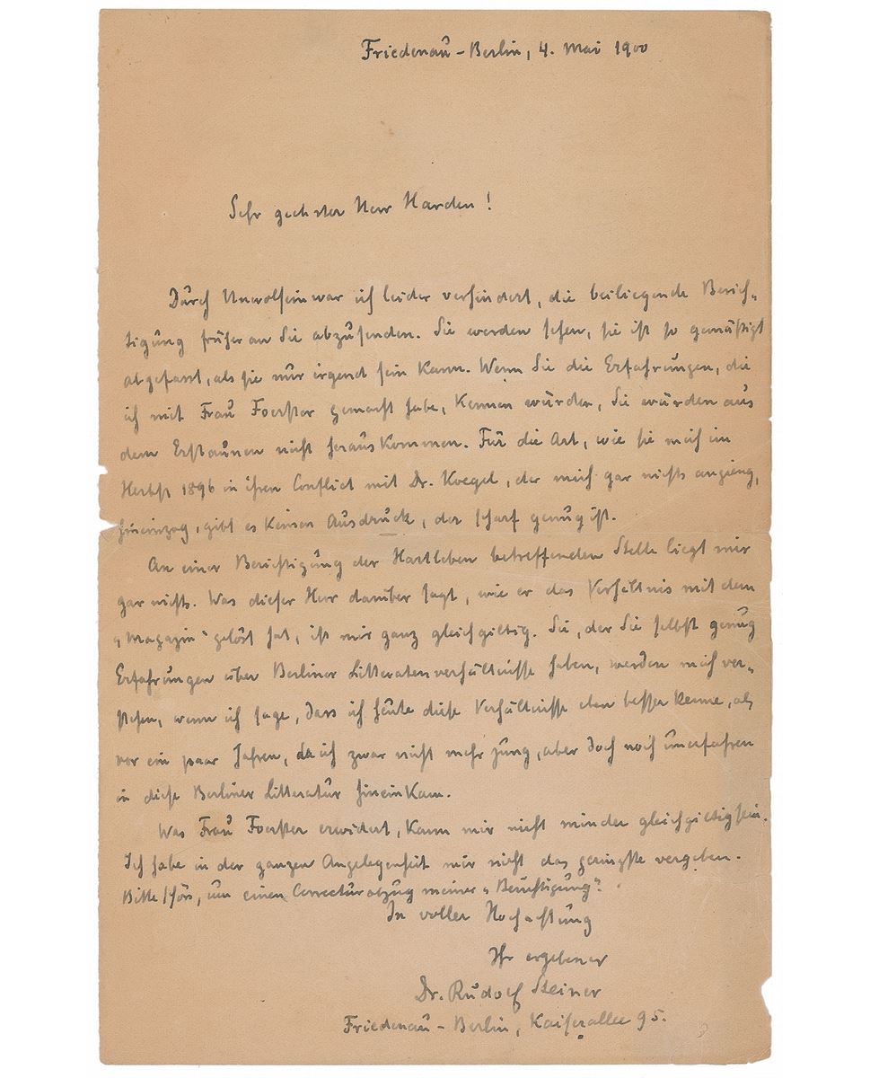 Controversial and prolific Austrian writer and philosopher (1861–1925) who founded such disciplines as anthroposophy, biodynamic agriculture, eurythmy, and Waldorf education. ALS in German, signed “Dr. Rudolf Steiner,” one page, 5.5 x 8.75, May 4, 1900. Untranslated letter to Maximilian Harden, sending some corrections of an article by Ernst Horneffer about the Weimar Nietzsche Archive. Small edge chips and tears and overall toning, otherwise fine condition.