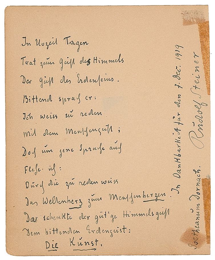 Controversial and prolific Austrian writer and philosopher (1861–1925) who founded such disciplines as anthroposophy, biodynamic agriculture, eurythmy, and Waldorf education. Exceedingly scarce AQS in German on an off-white 4.25 x 5.25 sheet, signed vertically on the right side by Rudolf Steiner. The passage, in full: "In Urzeit Tagen / Trat zum Geist des Himmels / Der Geist des Erdenseins / Bittend sprach er: / Ich weiss zu reden / Mit dem Menschengeist; / Doch um jene Sprache auch / Flehe ich, / Durch die zu reden weiss / Das Weltenherz zum Menschenherzen. / Da schenkte der güt'ge Himmelsgeist / Dem bittenden Erdengeist: / Die Kunst." The text, loosely translated, in full: 'In primeval days / Joined the spirit of heaven / The spirit of the earth. / He asked: / I know to talk / With the human spirit; / But also that language / I beg, / By the white know / The worlds heart to man. / That's the kind of heavenly spirit / The begging earth spirit: / Art." Steiner adds next to his signature, "Goetheanum, Dornach, In Dankbarkeit fur den 7. Dec. 1919." In very good to fine condition, with old tape stains to the right edge.