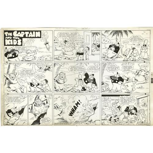 <B>Rudolph Dirks - The Captain and the Kids Sunday Comic Strip Original Art, dated 6-25-44 (United Features Syndicate, 1944).</B></I> One of the inspired pioneers of the field, Rudolph Dirks drew the side-splitting antics of the <I>The Captain and the Kids</B></I>, off-and-on-again, until 1958, when he finally handed the strip over to his son, John. Hans and Fritz are doubly punished for their love of fireworks in this explosive Sunday. Mama, the Captain, and the Inspector co-star in the mayhem that ensues. The image area of the strip measures 22.5" x 14.5", and the art is in Excellent condition.