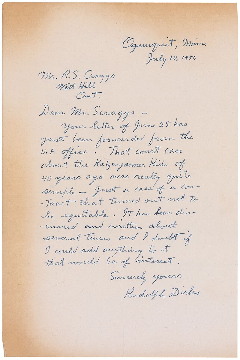 Cartoonist (1877–1968) who originated the popular strip Katzenjammer Kids in 1897. When he took a break from Hearst’s New York Journal in 1912, the Journal continued the comic with a different artist. In the resulting lawsuit, Dirks won the right to draw his characters but had to write his strip under a different title. ALS, one page, 7 x 10.5, July 10, 1956. Letter to R. S. Craggs. In part: “That court case about the Katzenjammer Kids of 40 years ago was really quite simple—just a case of a contract that turned out not to be equitable. It has been discussed and written about several times and I doubt if I could add anything to it that would be of interest.” Central horizontal and vertical folds, light scattered creases, and moderate irregular toning to the borders, otherwise fine condition.
