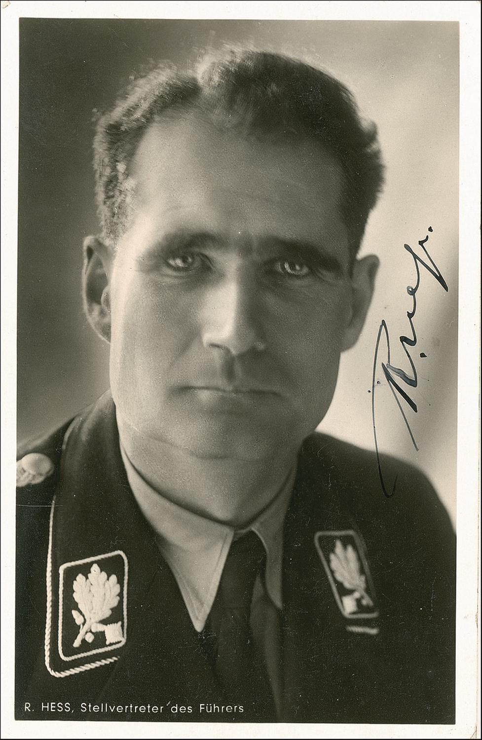 Personal deputy to Adolf Hitler (1894–1987). Convicted at Nuremberg and sentenced to a life sentence, he was incarcerated at Spandau Prison in Berlin, where, following the releases of fellow convicts Baldur von Schirach and Albert Speer in 1966, he remained the sole inmate for two decades, until his apparent suicide. Intense 3.5 x 5.5 postcard photo of Hess in uniform, signed “R. Hess” in fountain pen. In fine condition, with scattered surface marks, corner bumps, and silvering to the darker areas.