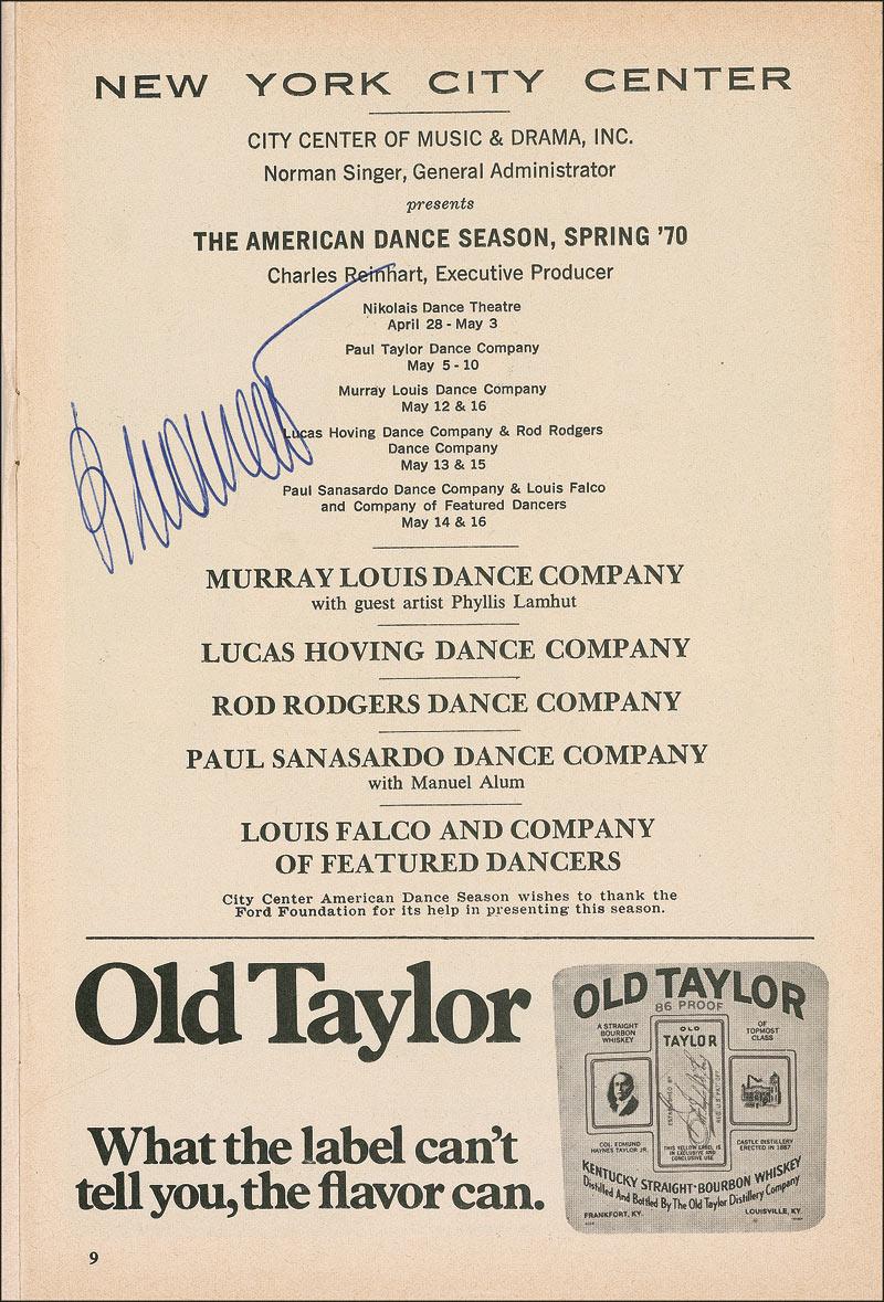 Program for The American Dance Season, 6 x 9, May 1970, signed on page 9 in blue ballpoint by Nureyev, who was in the audience. In fine condition, with light edge toning. Pre-certified PSA/DNA and RRAuction COA.