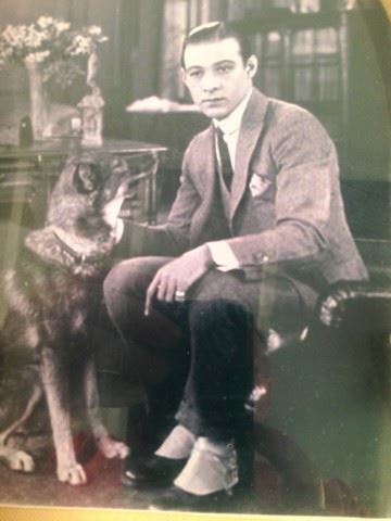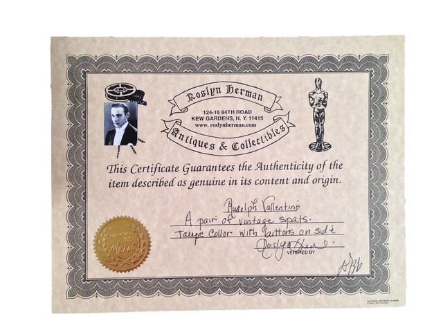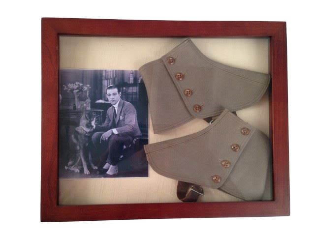 Rudolph Valentino vintage taupe colored spats with buttons on the side. The spats come mounted in a wood and glass frame which includes a picture of the star wearing the spats. Includes a certificate of authenticity from 'Roslyn Herman Antiques & Collectibles'. (Frame 15.5"x12.5"x2").