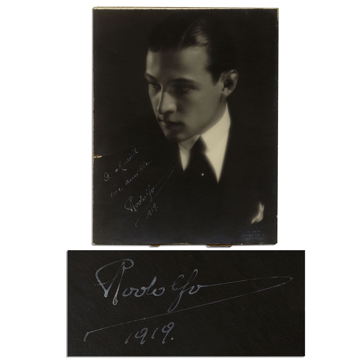 Rudolph Valentino photo signed and inscribed in Italian. Black and white bust portrait of a pensive-looking Valentino is inscribed to one Murriell and signed, ''Rodolfo / 1919''. Matte photo bears the stamp of Hoover Art Co. of Los Angeles. Measures 7.5'' x 9.25'', mounted to heavier board. Trimming to edges, very light silvering and a discreet tear to the left edge, else near fine.