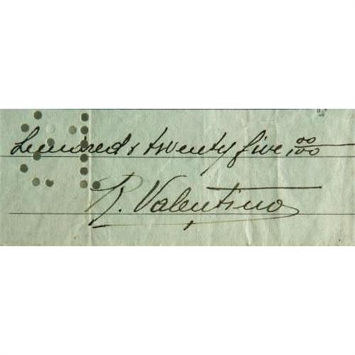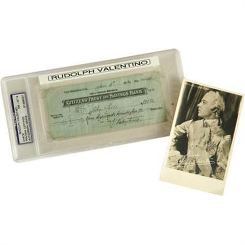 <B>Rudolph Valentino Signed Check And Postcard.</B></I> A personal check dated January 4, 1920, signed by the legendary silent-era heartthrob. The check, for $125, was made out to famed cinematographer John Seitz (signed by Seitz en verso), who shot the Valentino films <I>The Conquering Power,</B></I> <I>Uncharted Seas,</B></I> and <I>The Four Horsemen of the Apocalypse.</B></I> The lot also includes a vintage Italian photo postcard with Valentino's signature printed in white over a publicity still from his 1924 film <I>Monsieur Beaucaire.</B></I> Both items are in Very Fine condition with the check showing mild wear, corner creasing, a little staining around the edges, and the usual bank cancellation marks. <I>The check is encased and accompanied by a PSA/DNA authenticity certification seal.</B></I> <I>Accompanied by LOA from PSA/DNA.</B></I><BR><BR><b>Shipping:</b> Flat Material, Small (<a target="_blank" href="http://www.heritageauctions.com/common/shipping.php">view shipping information</a>)