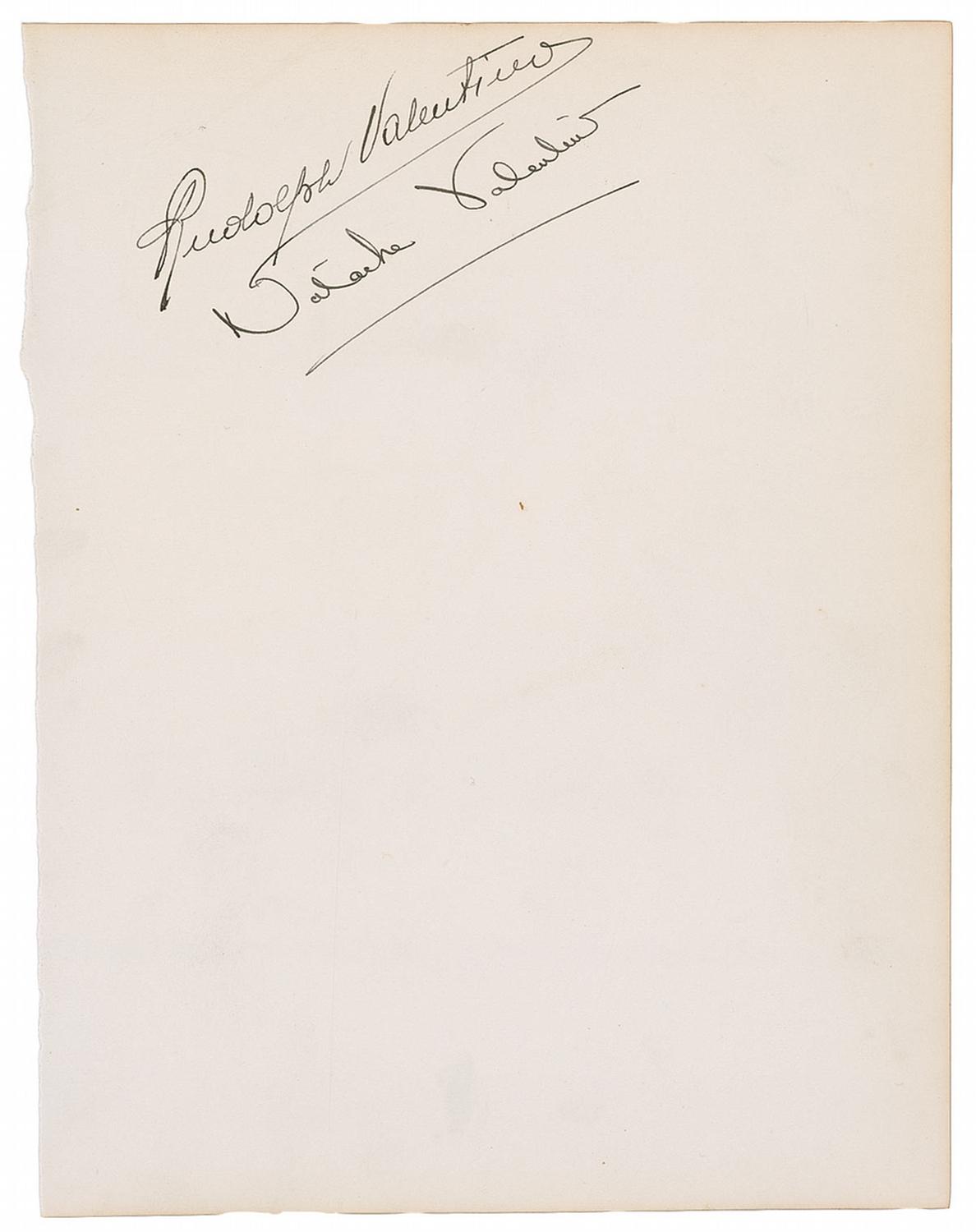 Italian-born actor (1895–1926) who became the most legendary sex symbol of the silent era. His premature death from a perforated ulcer induced a wave of fan hysteria unmatched until the modern “paparazzi” age, including riots and suicide attempts by grief-stricken fans. Vintage fountain pen signatures, “Rudolph Valentino” and “Natacha Rambova,” on an off-white 6 x 8 album page. In fine condition, with some mild edge toning. An exceptional example!