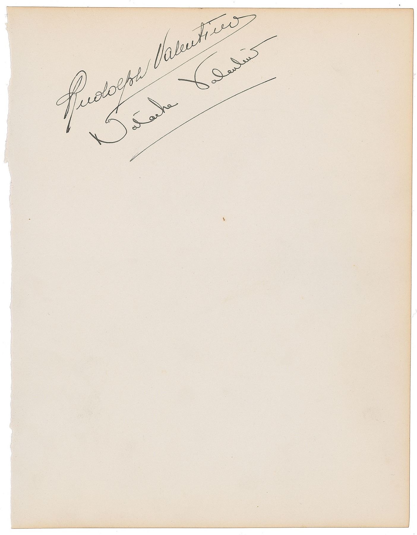 Vintage ink signatures, "Rudolph Valentino" and "Natacha Valentino," on an off-white 6 x 8 album page. In fine condition.