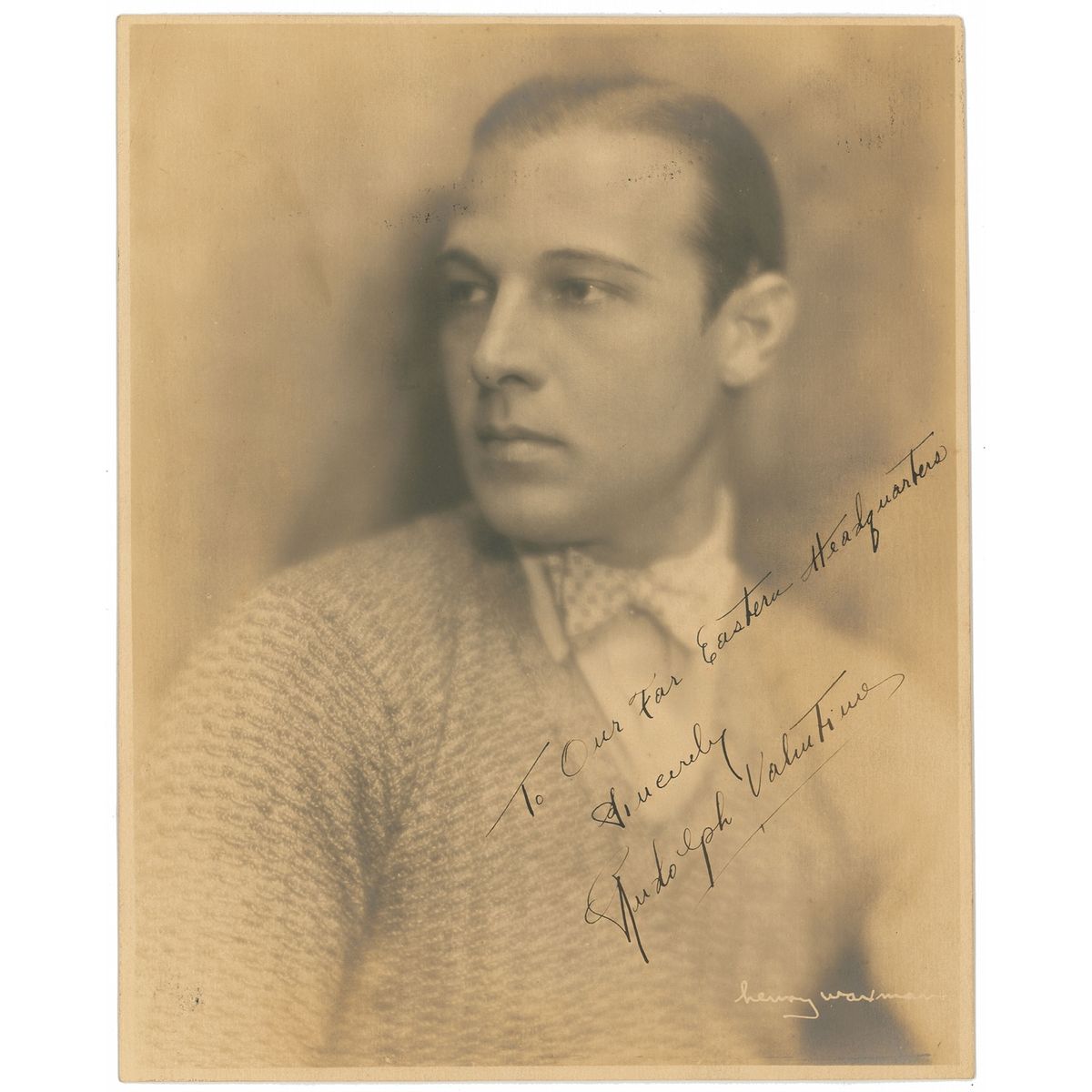 Italian-born actor (1895–1926) who became the most legendary sex symbol of the silent era. His premature death from a perforated ulcer induced a wave of fan hysteria unmatched until the modern “paparazzi” age, including riots and suicide attempts by grief-stricken fans. Uncommon matte-finish 7.5 x 9.5 Henry Waxman photo of the actor in a sweater and bow tie, signed and inscribed in fountain pen, “To Our Far Eastern Headquarters, Sincerely, Rudolph Valentino.” In fine condition, with a small crease to top left corner and a bit of scattered light soiling, mainly to upper portion of image.