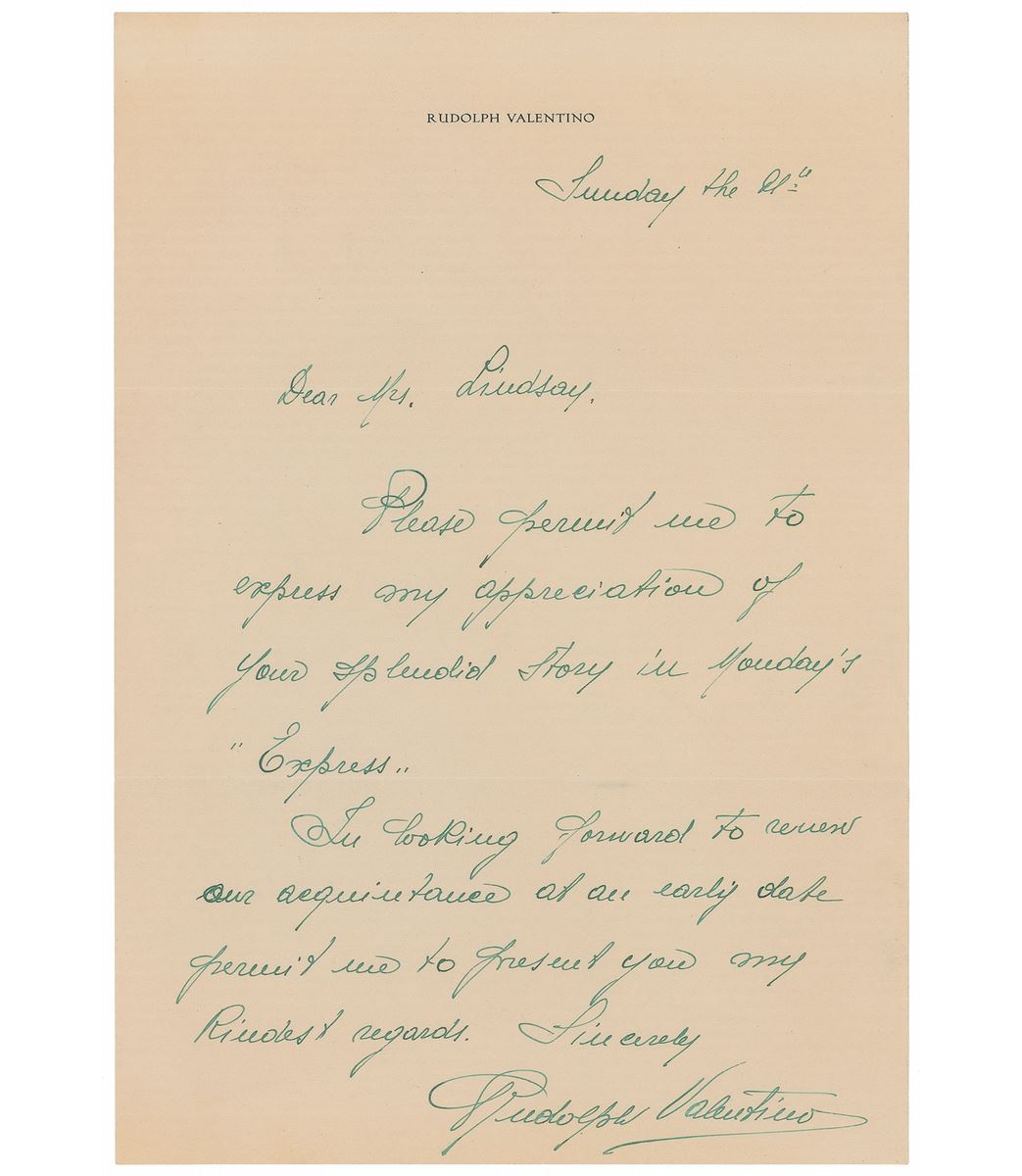 ALS, one page, 7.25 x 10.5, personal letterhead, no date but circa 1920s. Letter to “Mrs. Lindsay,” a reporter. In full: “Please permit me to express my appreciation of your splendid story in Monday’s ‘Express.’ In looking forward to review our acquaintance at an early date permit me to present you my kindest regards.” In fine condition. A superb example from the foremost sex symbol of the 1920s.