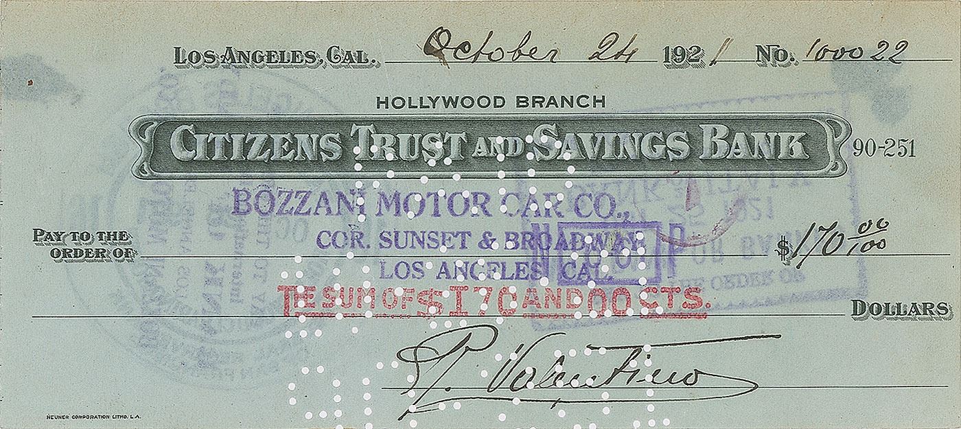 Citizens Trust and Savings Bank check, 6 x 2.75, filled out and signed by Valentino, "R. Valentino," payable to Bozzani Motor Car Co. for $170, October 24, 1921. In fine condition, with light show-through from two old mounting remnants on the reverse.