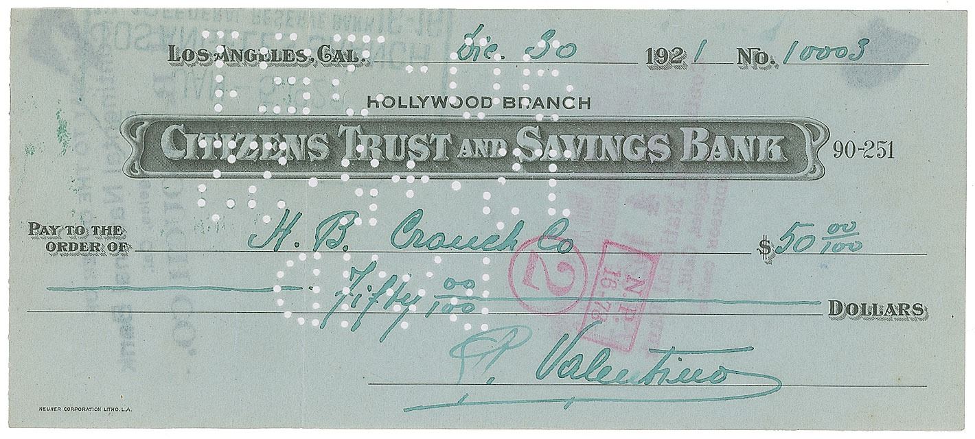 Citizens Trust and Savings Bank check, 6 x 2.75, filled out and signed by Valentino, "R. Valentino," payable to H. B. Crouch Co. for $50, December 30, 1921. In fine condition, with light show-through at the upper corners from old mounting traces on the reverse. H. B. Crouch was a Los Angeles jewelry company.