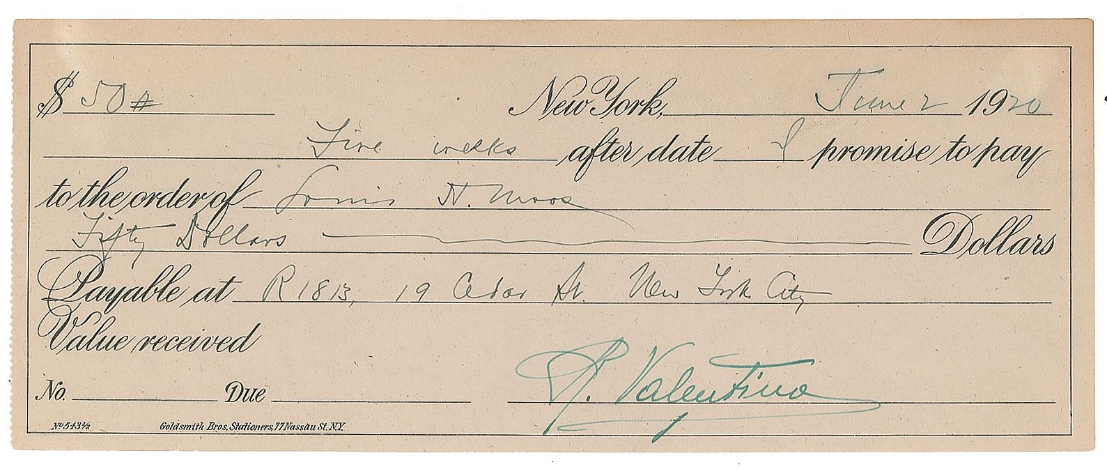Bank check, 8.25 x 3.25, filled out in another hand and signed by Rudolph Valentino, "R. Valentino," payable to his attorney Louis H. Moos for $50, June 2, 1920. In fine condition, with thin paper to the upper corners.
