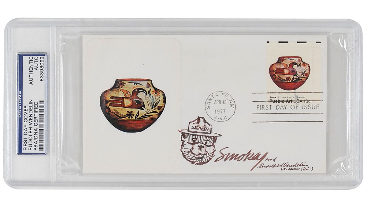 Original signed ink sketch of Smokey Bear on a 6.5 x 3.5 FDC with a cachet honoring Pueblo art, signed in ink, “Smokey, Rudolph Wendelin, his artist (ret).” Encapsulated in a plastic PSA/DNA authentication holder. In fine condition.