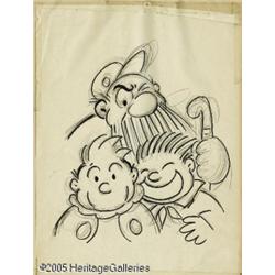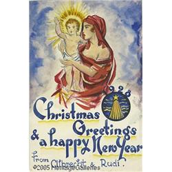 <B>Rudolph and John Dirks - Original Artwork, Correspondences, and Memorabilia (various dates).</B></I> A very interesting collection of original artwork (a gorgeous hand-painted Christmas card from 1928, a few small illustrations, a large 18" x 24" sketch pad with many rough sketches), production materials (including <I>Captain and the Kids</B></I> photostat headers, used in the Sunday strips), correspondences, catalogs, magazines, clippings, promotional items (including some neat folders put out by United Feature Syndicate promoting the strip), and more. There are over fifty items in this lot, all of them fascinating.Condition on the different items varies wildly, with most having suffered some wear. A truly enlightening peek into a renowned cartooning dynasty! <I>From the collection of Rudolph and John Dirks.</B></I>