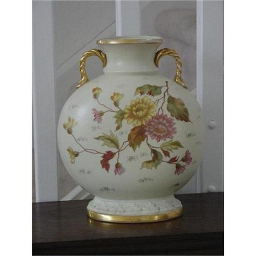 An early 20th century porcelain vase, 10" tall, 8" wide, decorated with flowers and trimmed with gold. Made in Germany, this Rudolstadt vase has braided handles trimmed with gold. Condition is very good there are no chips or cracks, although there is some loss to the gold trim. (3)