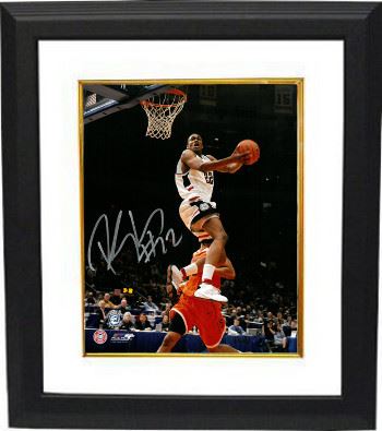 As a freshman at Connecticut in 2004–05, Rudy Gay was a co-winner of the Big East Conference Rookie of the Year award after averaging 11.8 points, 5.4 rebounds and 1.5 assists on .462 shooting in 28.8 minutes in 31 games. He was a unanimous Big East All-Rookie Team selection, was named National Freshman of the Year by The Sporting News, and earned Big East Rookie of the Week honors five times.Gay led the Huskies to a 30–3 record, and finished his college career with 20 points and six rebounds in a career-high 42 minutes in an NCAA Elite Eight loss to George Mason on March 26, 2006. In February 2012, Gay was inducted into the "Huskies of Honor". Rudy Gay has hand signed this 8x10 Photo. Certificate of Authenticity from Athlon Sports Collectibles. Custom White Mat and Premium Black Color Framed as shown.