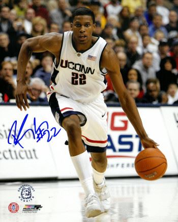 As a freshman at Connecticut in 2004–05, Rudy Gay was a co-winner of the Big East Conference Rookie of the Year award after averaging 11.8 points, 5.4 rebounds and 1.5 assists on .462 shooting in 28.8 minutes in 31 games. He was a unanimous Big East All-Rookie Team selection, was named National Freshman of the Year by The Sporting News, and earned Big East Rookie of the Week honors five times.Gay led the Huskies to a 30–3 record, and finished his college career with 20 points and six rebounds in a career-high 42 minutes in an NCAA Elite Eight loss to George Mason on March 26, 2006. In February 2012, Gay was inducted into the "Huskies of Honor". Rudy Gay has hand signed this 8x10 Photo. Certificate of Authenticity from Athlon Sports Collectibles.