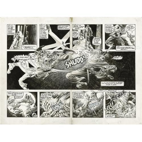 <B>Rudy Nebres - Deadly Hands of Kung-Fu #29 pages 8 and 9 Original Art (Marvel, 1976).</B></I> Shang-Chi faces off against a surly samurai in this spectacular 2-page spread that features a foot-in-your-face central panel sure to knock your socks off. The image area for both pages combined measures 21" x 15" and the art is in Excellent condition with light overall aging.