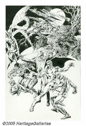 <B>Rudy Nebres - Phantom, Flash Gordon, and Mandrake Illustration Original Art (undated).</B></I> Rudy Nebres' spectacular illustration spotlights the heroes of the 1986 TV cartoon show, "Defenders of the Earth." Set in the year 2015, Ming the Merciless is now poised to conquer the world. Flash Gordon, the Phantom, and Mandrake the Magician all team-up to defeat him. Their strike force is fortified by Lothar, Rick Gordon (Flash's son), Jedda Walker (Phantom's daughter), L. J. (Lothar's son), and Kshin (an orphan). The overall size of this magnificent scene is 19.5" x 29.5", and the art is in Excellent condition.