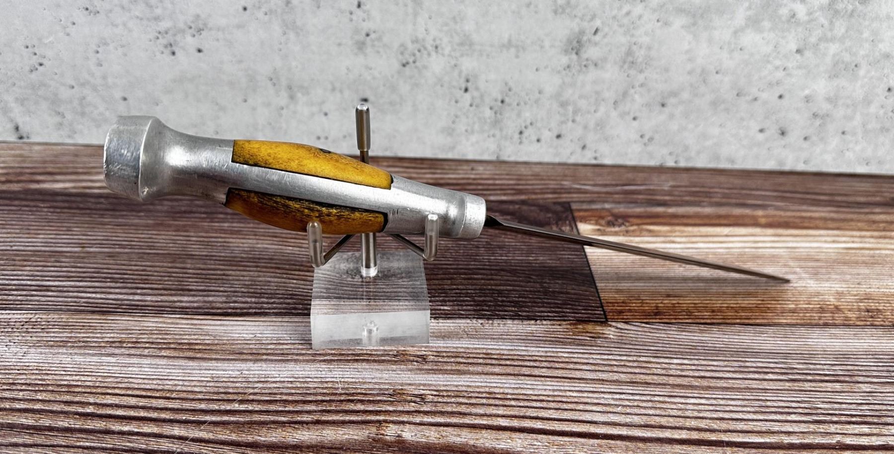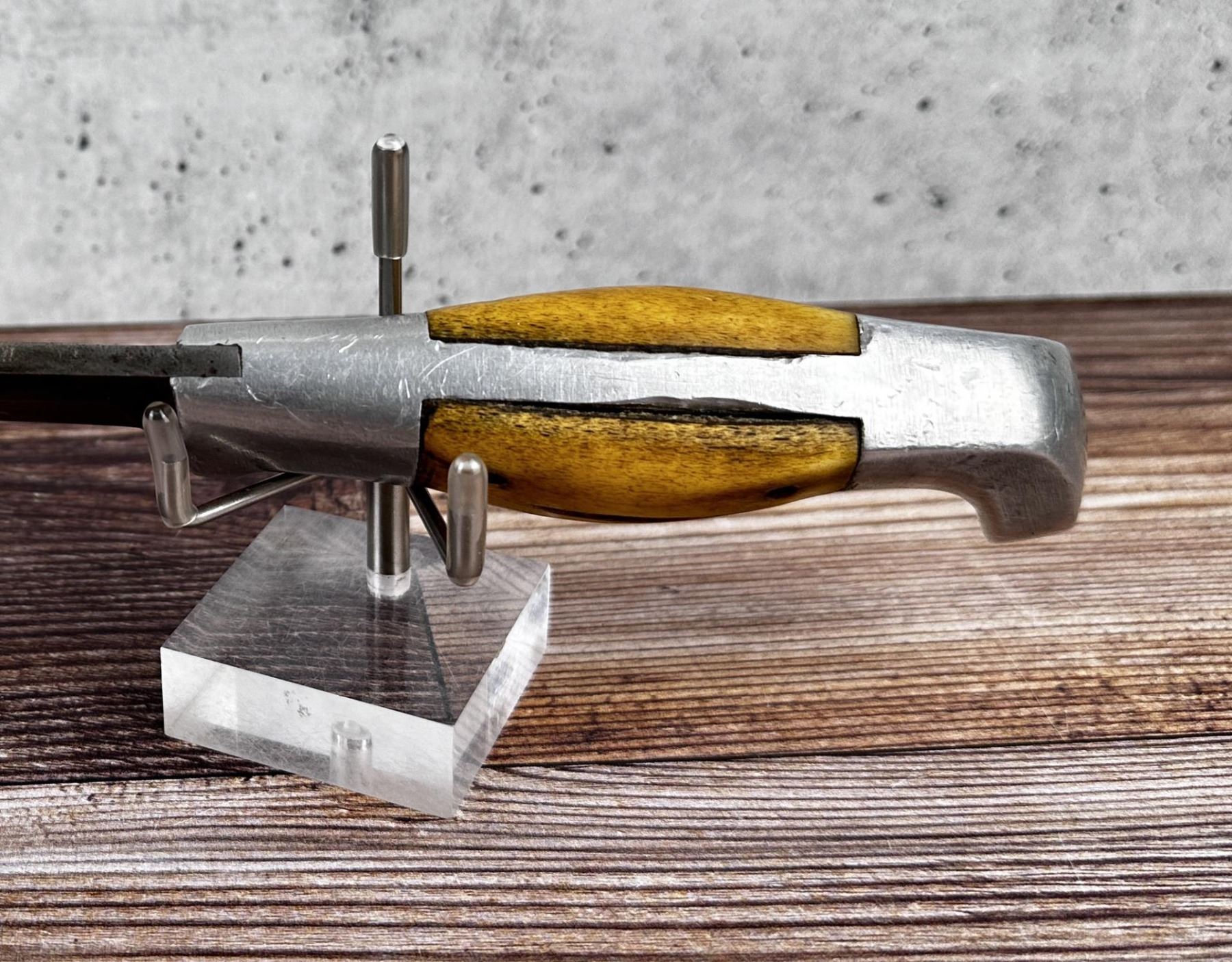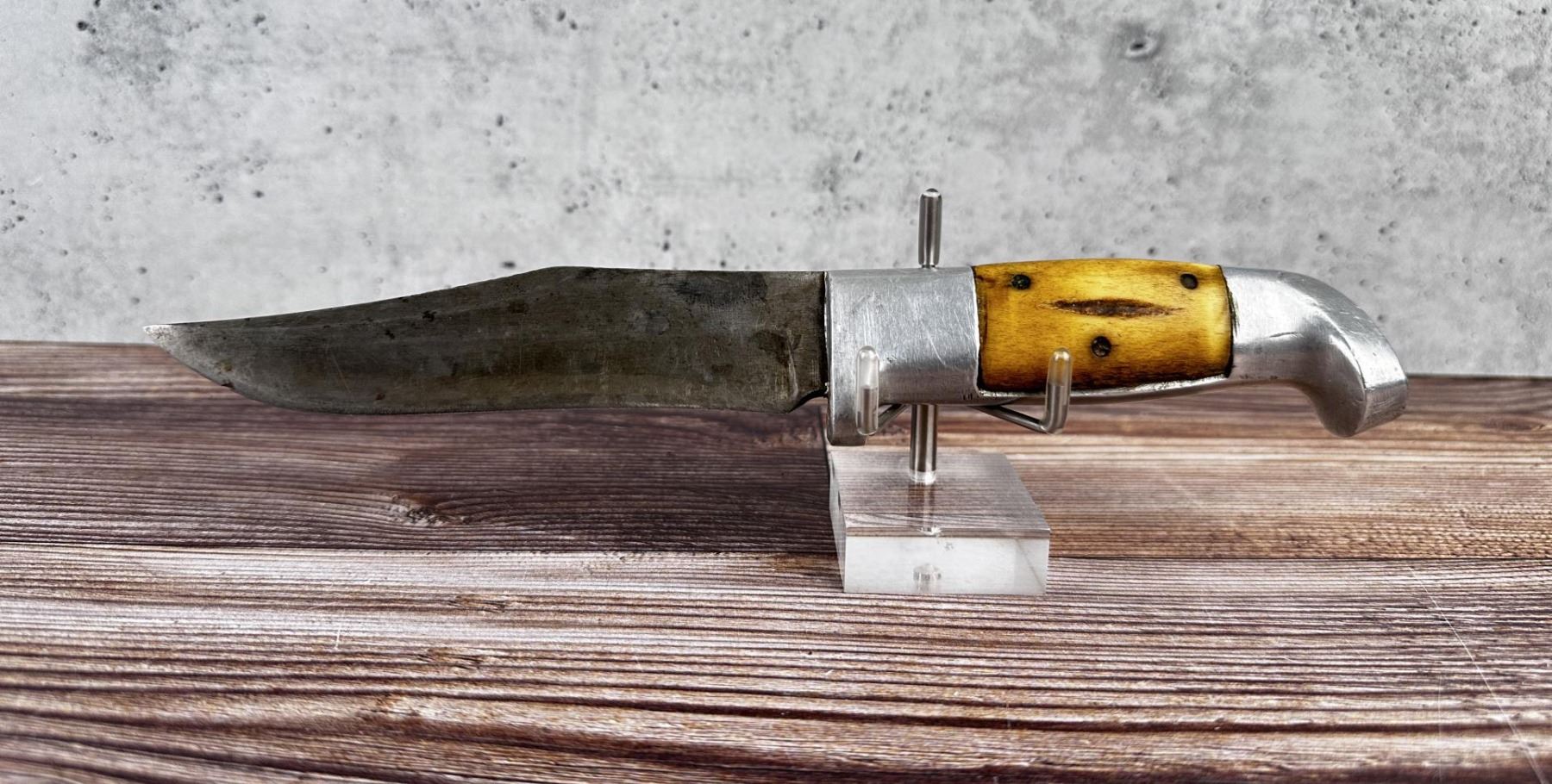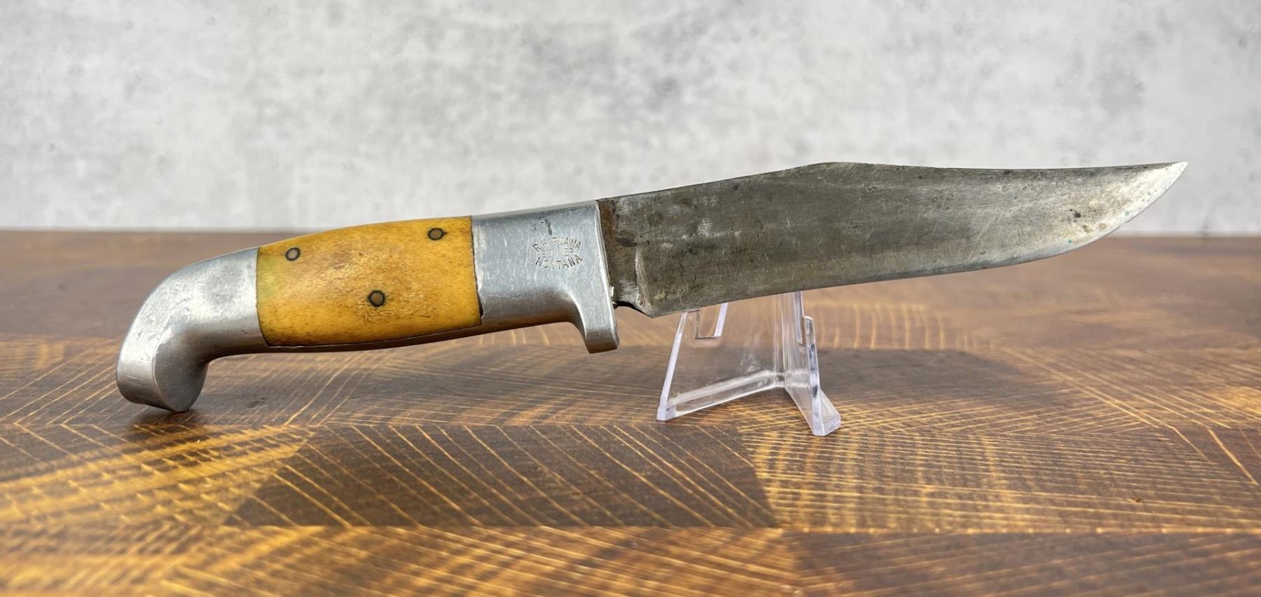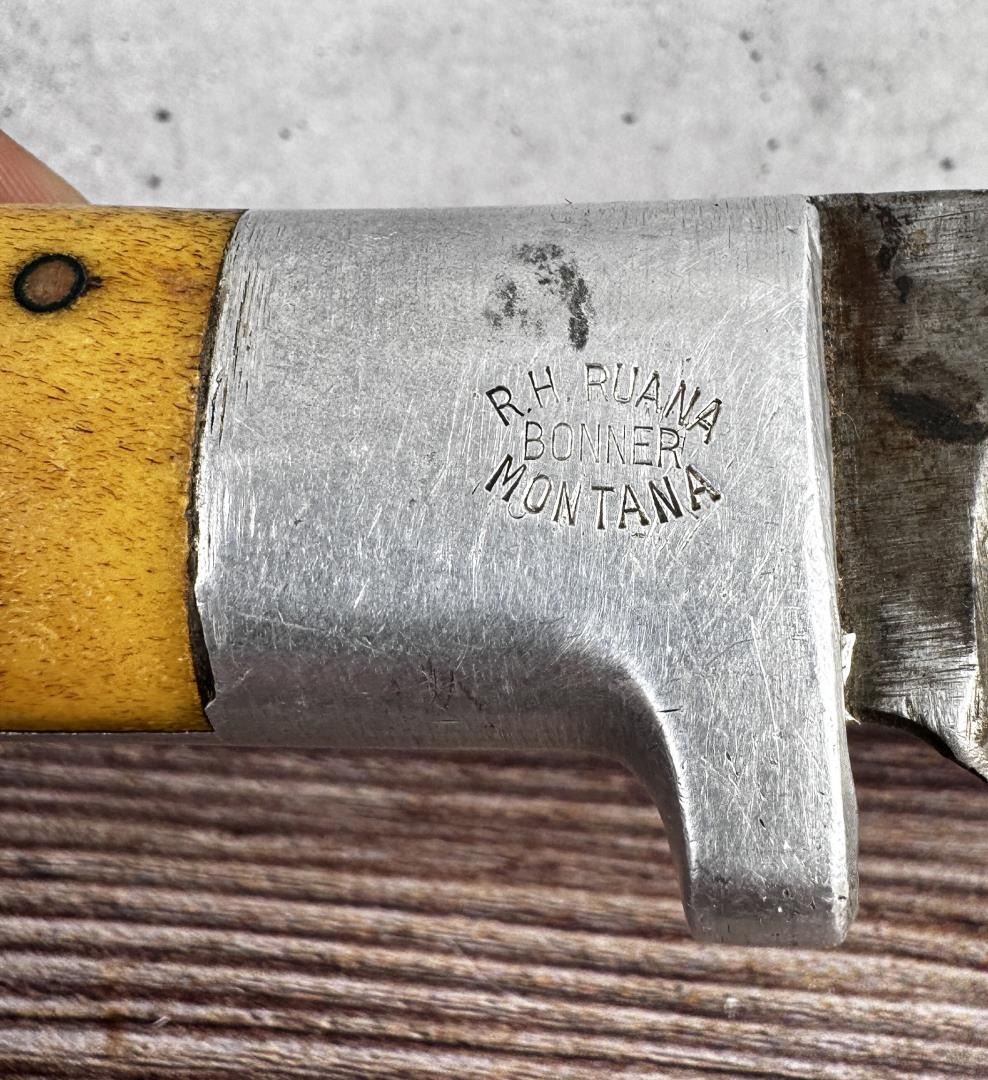 10" long. No sheath. Three Pin, Square Cut, Made 1943-1944. Made by Rudy Ruana in Bonner Montana. No cracks or damage to the aluminum.