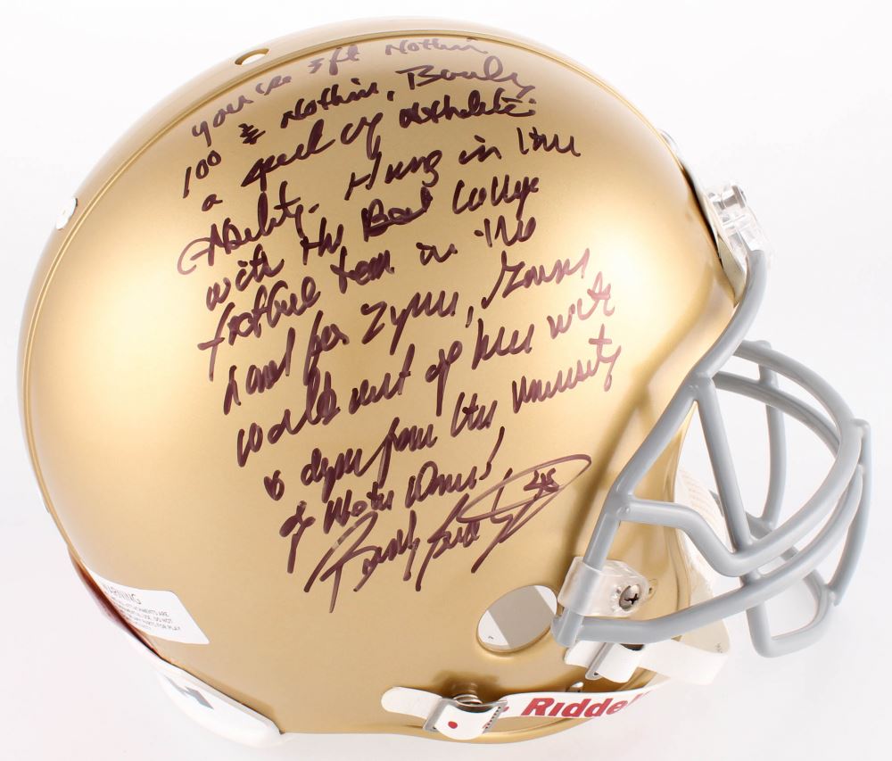 Riddell Notre Dame Fighting Irish authentic on-field full-size helmet. Hand-signed and inscribed in black felt-tip pen by Rudy Ruettiger.