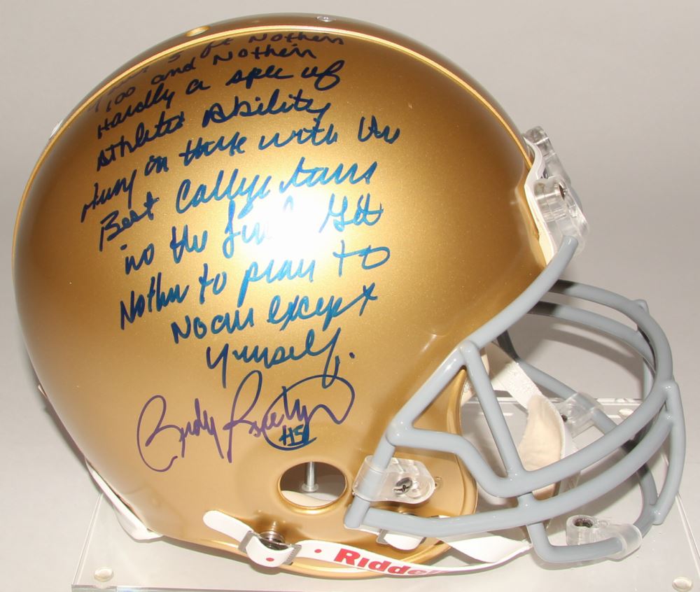 Inscription reads "You're five foot nothin', a hundred and nothin', and you have barely a speck of athletic ability. And you hung in there with the best college football players in the land for 2 years. And you're gonna walk outta here with a degree from the University of Notre Dame. In this life, you don't have to prove nothin' to nobody but yourself."