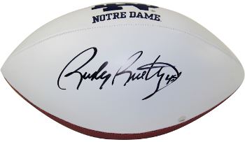 Rudy Ruettiger harbored a dream to play for the Notre Dame Fighting Irish football team, despite being undersized at merely 5'6" and 185 pounds. In Ruettiger's last opportunity to play for Notre Dame at home, Devine put him into a game as defensive end against Georgia Tech on November 8, 1975. In the movie Rudy, Devine is given a somewhat antagonistic role, not wanting Rudy to dress for his last game. However, in actuality, it was Devine who came up with the idea to dress Rudy. In the final play of Ruettiger's senior season with the Fighting Irish, he recorded a sack, which is all his Notre Dame stat line has ever shown. Ruettiger actually played for three plays. The first play was a kickoff, the second play was an incomplete pass, and on the third (and final) play he sacked Georgia Tech quarterback Rudy Allen. Rudy Ruettiger has hand signed this Notre Dame Fighting Irish White Logo Football. Steiner Sports Hologram and Certificate of Authenticity.