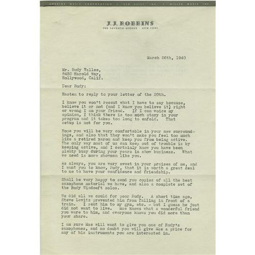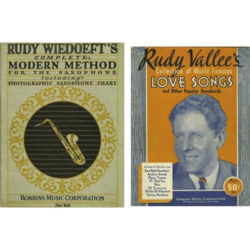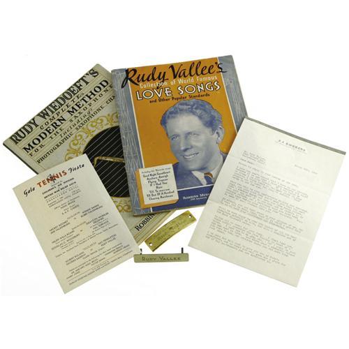 <B>Rudy Vallee Archive.</B></I> One of the most popular entertainers of the 1930s, singer-saxophonist Rudy Vallee had a career that spanned decades. Featured are a car plate and door plate inscribed with Rudy's name; a program for a 1941 charity tennis event in which Vallee and actor-strongman Nat Pendleton squared off against actor Gilbert Roland and vocalist George Murphy; and two songbooks that belonged to him, "Rudy Vallee's Collection of World Famous Love Songs" and "Rudy Wiedoeft's Complete Modern Method for the Saxophone." Wiedoeft was a huge influence on Vallee, and his death by cirrhosis of the liver in 1940 was sudden and tragic, a fact mentioned in the March 26, 1940 letter to Vallee from music publisher J.J. Robbins, also included in this lot. All items are in Superb condition, with only a modest amount of wear and tear due to age.