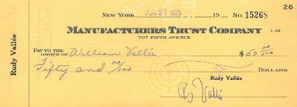 Rudy Vallee was given a recording contract and in 1928, he started performing on the radio. Vallee became the most prominent and, arguably, the first of a new style of popular singer, the crooner. Previously, popular singers needed strong projecting voices to fill theaters in the days before the electric microphone. Crooners had soft voices that were well suited to the intimacy of the new medium of the radio. Vallee's trombone-like vocal phrasing on "Deep Night" would inspire later crooners such as Bing Crosby, Frank Sinatra, and Perry Como to model their voices on jazz instruments.Vallee also became what was perhaps the first complete example of the 20th century mass media pop star. Flappers mobbed him wherever he went. His live appearances were usually sold out, and even if his singing could hardly be heard in those venues not yet equipped with the new electronic microphones, his screaming female fans went home happy if they had caught sight of his lips through the opening of the emblematic megaphone he often sang through. This is a Rudy Vallee signed bank cancelled check from the Manufacturers Trust Company from 1935. Each Check pay to the order of/exact dates in 1935/and ink/cancel stamps vary from check to check. Certificate of Authenticity from Athlon Sports.