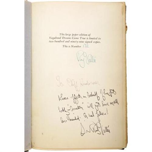 <B>Rudy Vallee Signed Autobiography: <I>Vagabond dreams Come True,</B></I></B></I> (New York: E.P. Dutton & Co., 1930), 262 pages, number 172 of a limited edition of 299 signed copies, 8vo (6.5” x 9.5”), printed card covers, tooled gilt spine, additionally inscribed on front endpaper: "<I>To Cliff Henderson whose efforts on behalf of his pet hobby -'aviation' will yet have us all air-minded. A real fellow! Sincerely Rudy Vallee.</B></I>” Sheer paper outer wrap deteriorating, else a very fine copy. Included is a loose print of the Vallee portrait appearing on the book's frontispiece. Crooner Rudy Vallee (1901-1986) was one of the 20th century's first true mega stars. That Vallee would present a copy of his book to Henderson indicates the aviation promoter's own elevated status in popular culture of the day. <I>From the collection of Cliff Henderson.</B></I><BR><BR><b>Shipping:</b> Books & Catalogs (<a target="_blank" href="http://www.heritageauctions.com/common/shipping.php">view shipping information</a>)