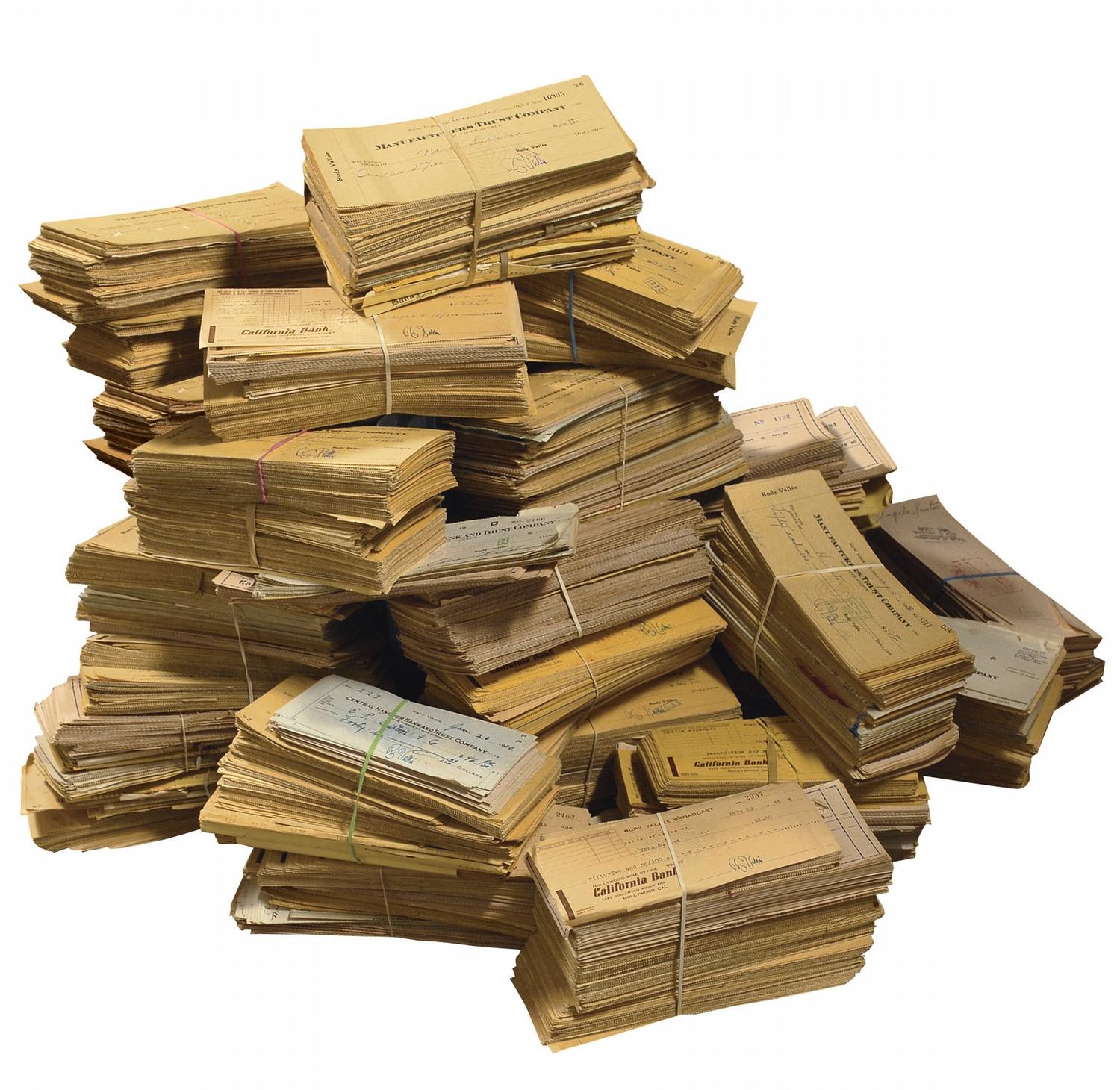 An absolutely enormous collection of approximately 14,000 personal, business, and bank checks from Rudy Vallee, all filled out in type or in another hand, dating from the 1930s and 40s, with almost all signed by Vallee, and a few signed by his attorney. Endorsements to some of the checks include Big Band leaders, western stars, and various Hollywood actors. In very good condition, with expected cancellation holes and stamps, scattered creases and expected wear. Originally acquired from his widow, this is a fiduciary feast from the prime of Vallee’s successful career. Oversized.