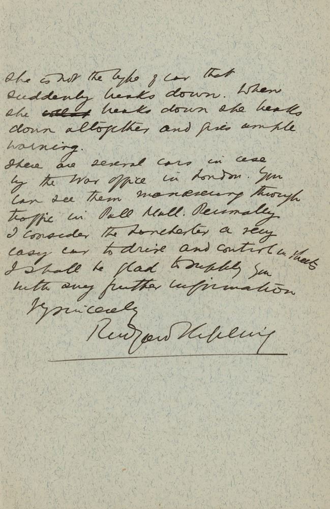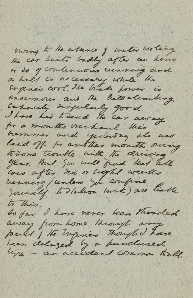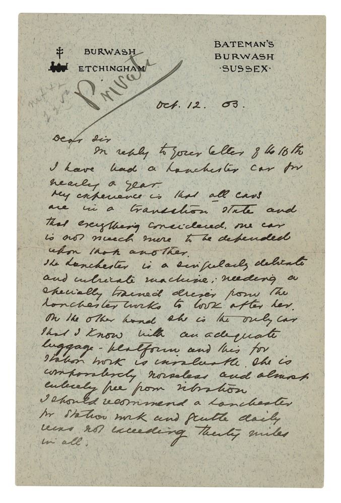 ALS, three pages on two adjoining sheets, 4 x 6, Bateman's letterhead, October 12, 1903. Handwritten letter regarding his Lanchester automobile, one of the first British-made cars. In part: "I have had a Lanchester car for nearly a year. My experience is that all cars are in a transition state and that everything considered, one car is not much more to be depended upon than another. The Lanchester is a singularly delicate and intricate machine; needing a specially trained driver from the Lanchester works to look after her. On the other hand she is the only car that I know with an adequate luggage-platform and this for station work is invaluable. She is completely noiseless and almost entirely free from vibration. I should recommend a Lanchester for station work and gentle daily runs not exceeding thirty miles in all…So far I have never been stranded away from home through any fault of the engine's though I have been delayed by a punctured tyre--an accident common to all. She is not the type of car that suddenly breaks down." In fine condition. Accompanied by the original mailing envelope.
