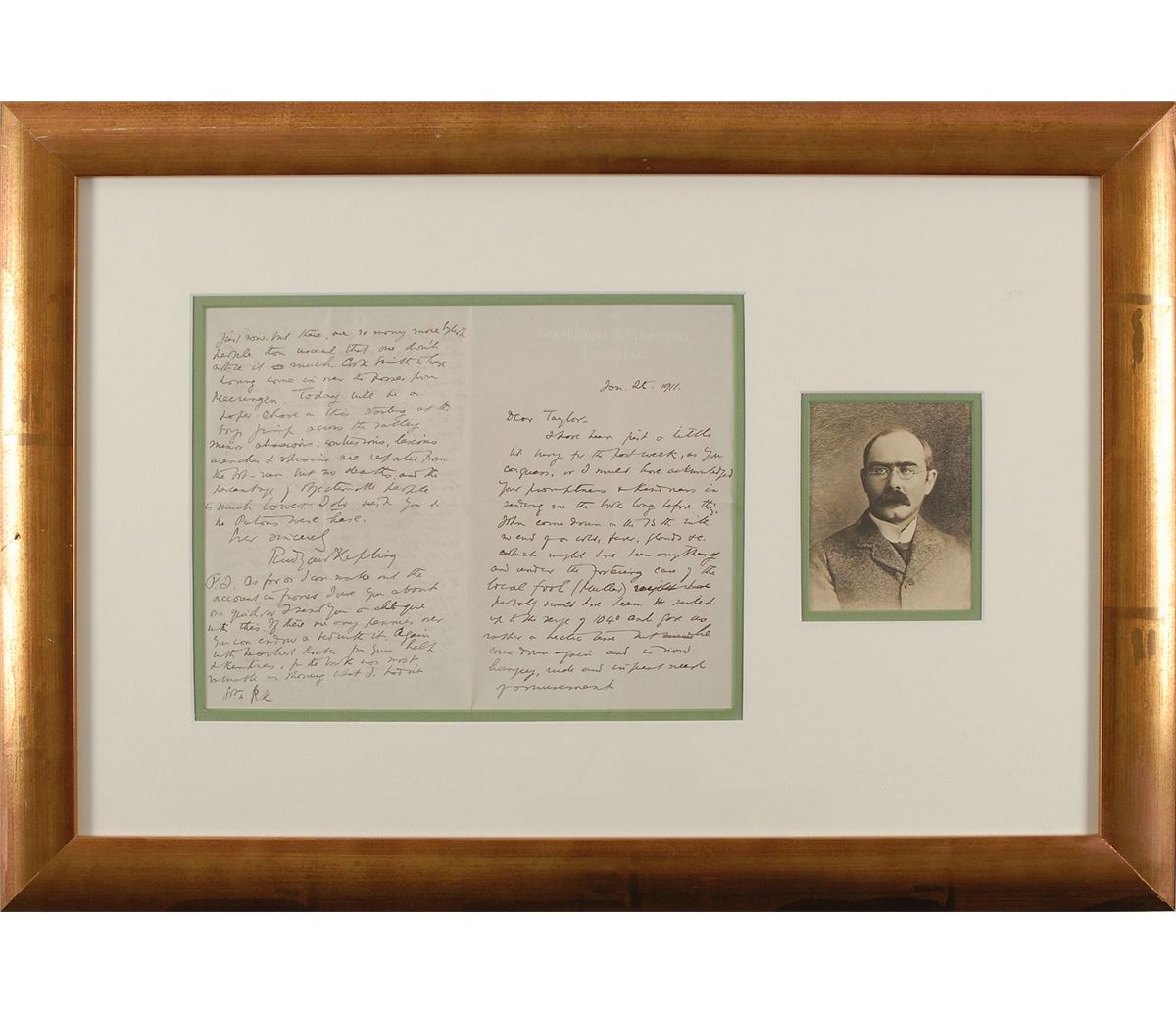 ALS signed twice, “Rudyard Kipling” and “RK,” three pages on two adjoining sheets, 4.75 x 7.5, Grand Hotel and Kurenstalt letterhead, January 25, 1911. Letter to C. H. S. Taylor, in part: “John came down on the 15th with no end of a cold, fever, glands, &c. which might have been anything and under the fostering care of the local fool (Muller) probably would have been. He sailed up to the verge of 104o and got us rather a hectic time but he came down again and is now hungry, rude and in great need of amusement. When I chuck up writing I am going to be a sick-nurse. I have great gifts that way-when the wife is nearby to support me. We’d had two days of valley fog after a long stretch of fine weather and today it looks as if it might snow. There isn’t quite enough snow for the ski-ers and the monastery slopes are about as hard as road-pavement. Still, beginners go out there and wonder why skiing is such hard work and why falling never gets softer. Waddy told me last night that a hockey-team from Lucerno had challenged us. He says that he understands that they have never handled a hockey-stick more than three times and so we shall win. It strikes me I heard the same yarn before Zurich took us on...Today will be a paper-chase on skis starting at the boys jump across the valley. Minor abrasions, contusions, lesions, wrenches & sprains are reported from the bob-run, but no deaths, and the percentage of objectionable people is much lower. I do wish you & the Patons were here.” Double-matted and framed unfolded with a head-and-shoulders portrait of Kipling to an overall size of 21.75 x 15, with a window on the reverse for viewing the second page. In fine condition, with intersecting folds. Accompanied by the original mailing envelope, addressed in Kipling’s hand. Awarded the Nobel Prize four years prior, Kipling had reached the peak of his literary career by 1911. Eager to escape London’s various entrapments, he would seek refuge amid the Swiss mountains of Engelberg; a necessary annual sojourn for Kipling, who, according to biographer Lord Birkenhead, longed for ‘the snow, the wind lipping over a pass…the icicles glittering from the rock-face and the racing mountain torrent that fed the sawmills.’ An insightful letter from the zenith of the English storyteller’s career.